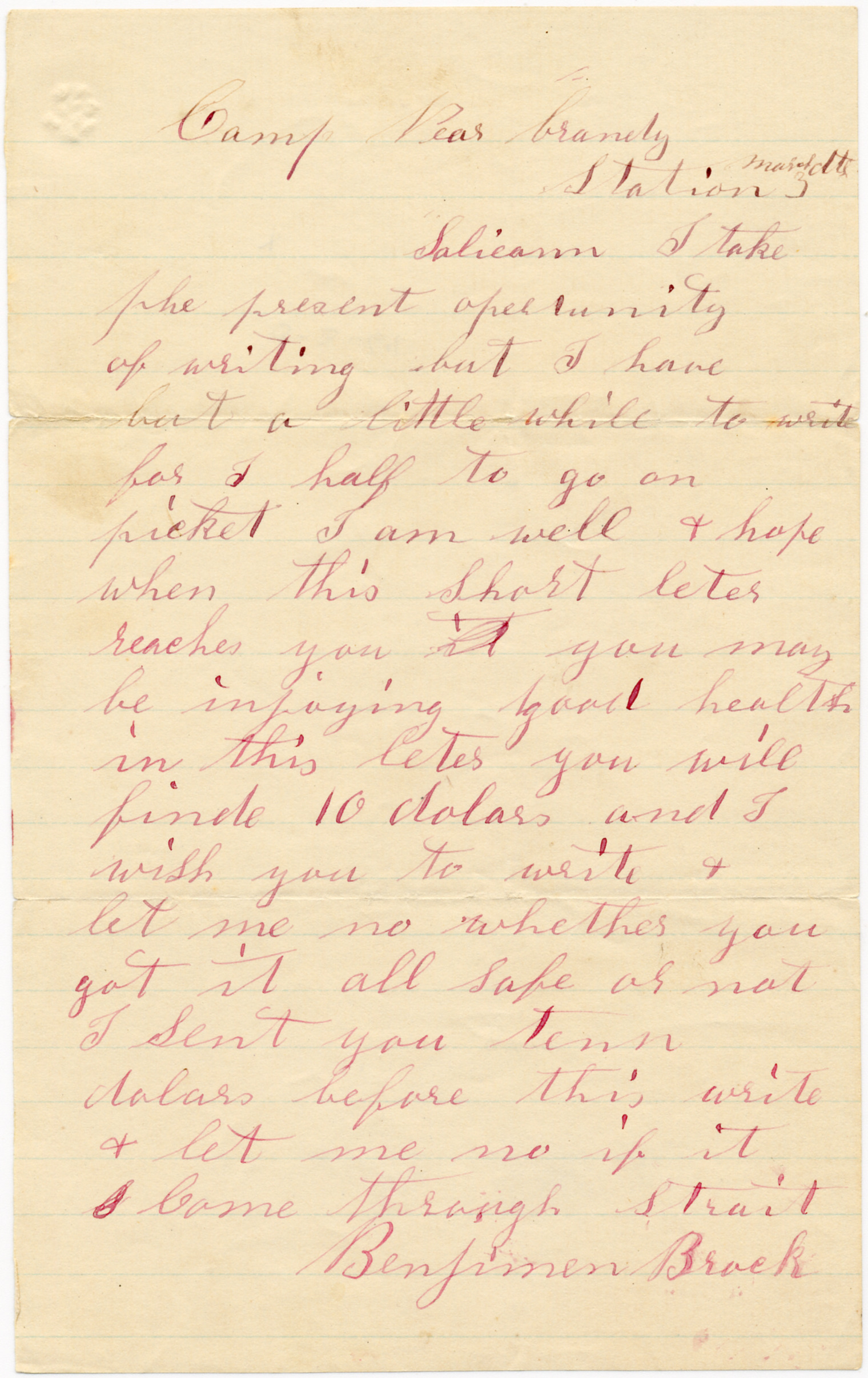Benjamin lets Sally know that he is presently on guard duty and he has enclosed ten dollars for her.