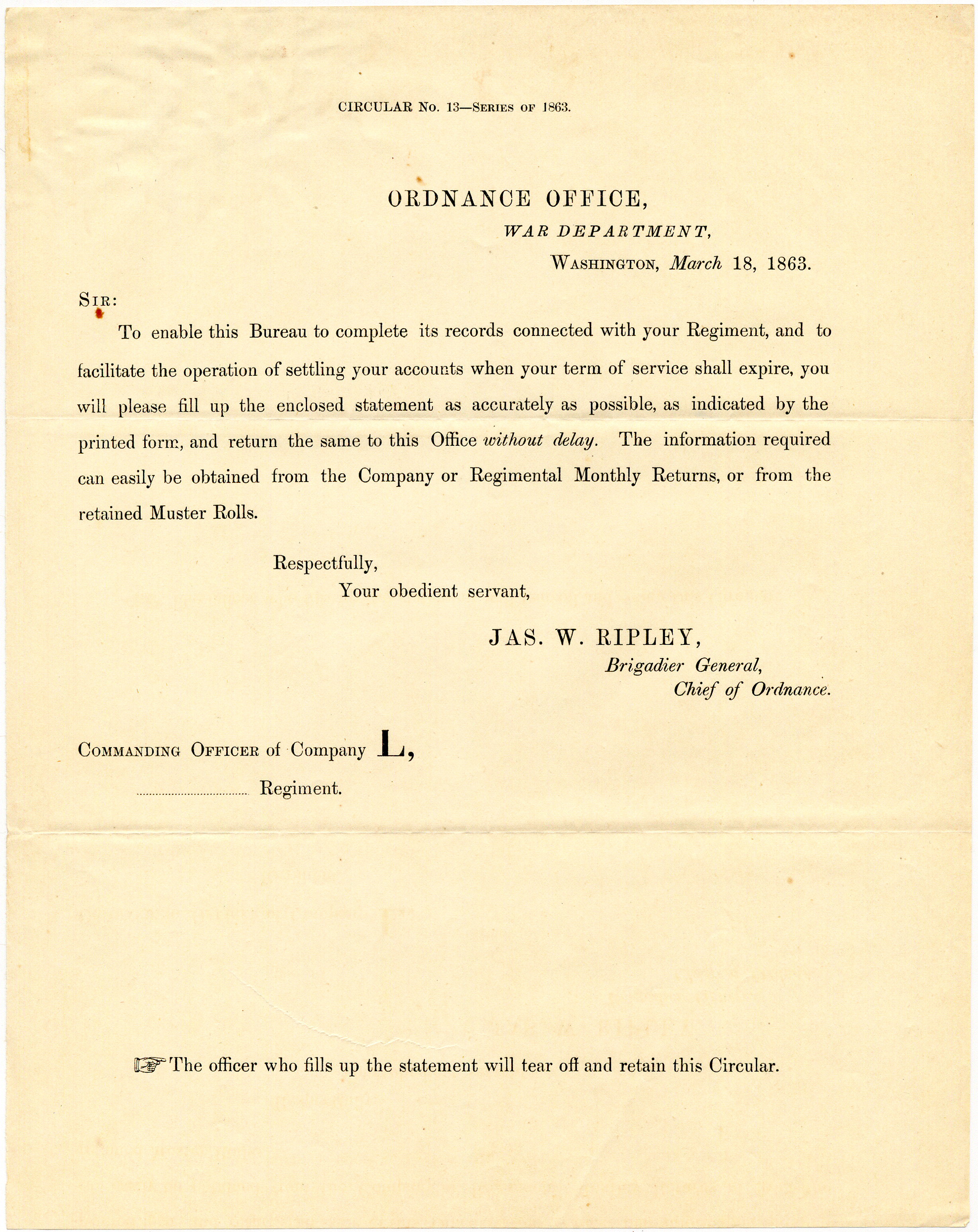 Benjamin D. Pritchard Military Records : Circular 13, Ordnance Office of the War Department