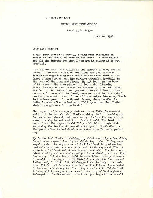 A letter from Arthur D. Baker to Bertha E. Malone concerning his father's part in the capture of John Wilkes Booth.