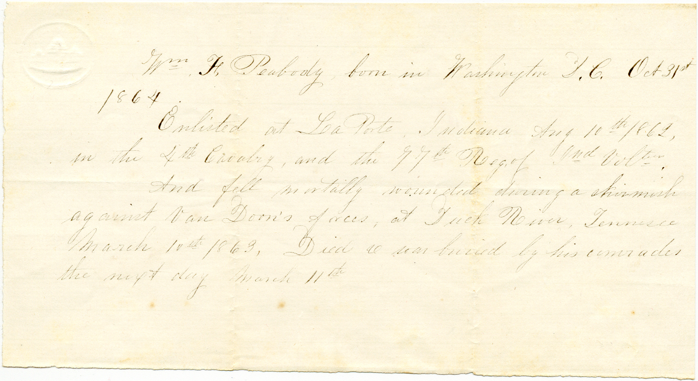 This notice states that William F. Peabody was killed in a skirmish at Duck River, Tennessee, and buried the following day.