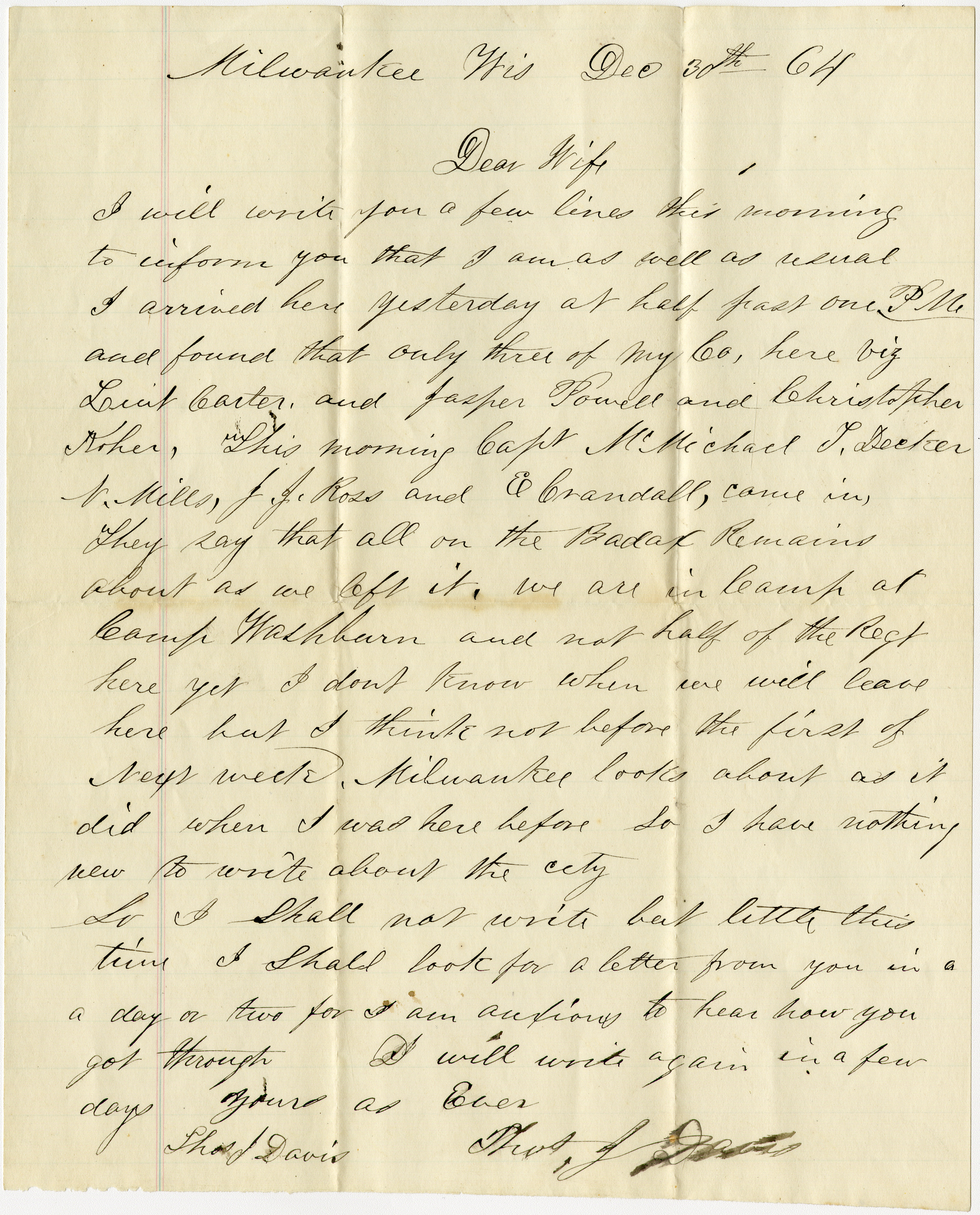Davis writes Lucinda noting that he arrived in Milwaukee, Wisconsin yesterday. He details that only three others from his Company were here, Lieutenant Carter, Jasper Powell, and Christopher Koher. Davis writes that this morning Robert McMichael, T. Decker, V. Mills, J.J. Ross, and E. Crandall arrived. Davis concludes by noting they are currently at Camp Washburn, and that he does not know when they will leave here.