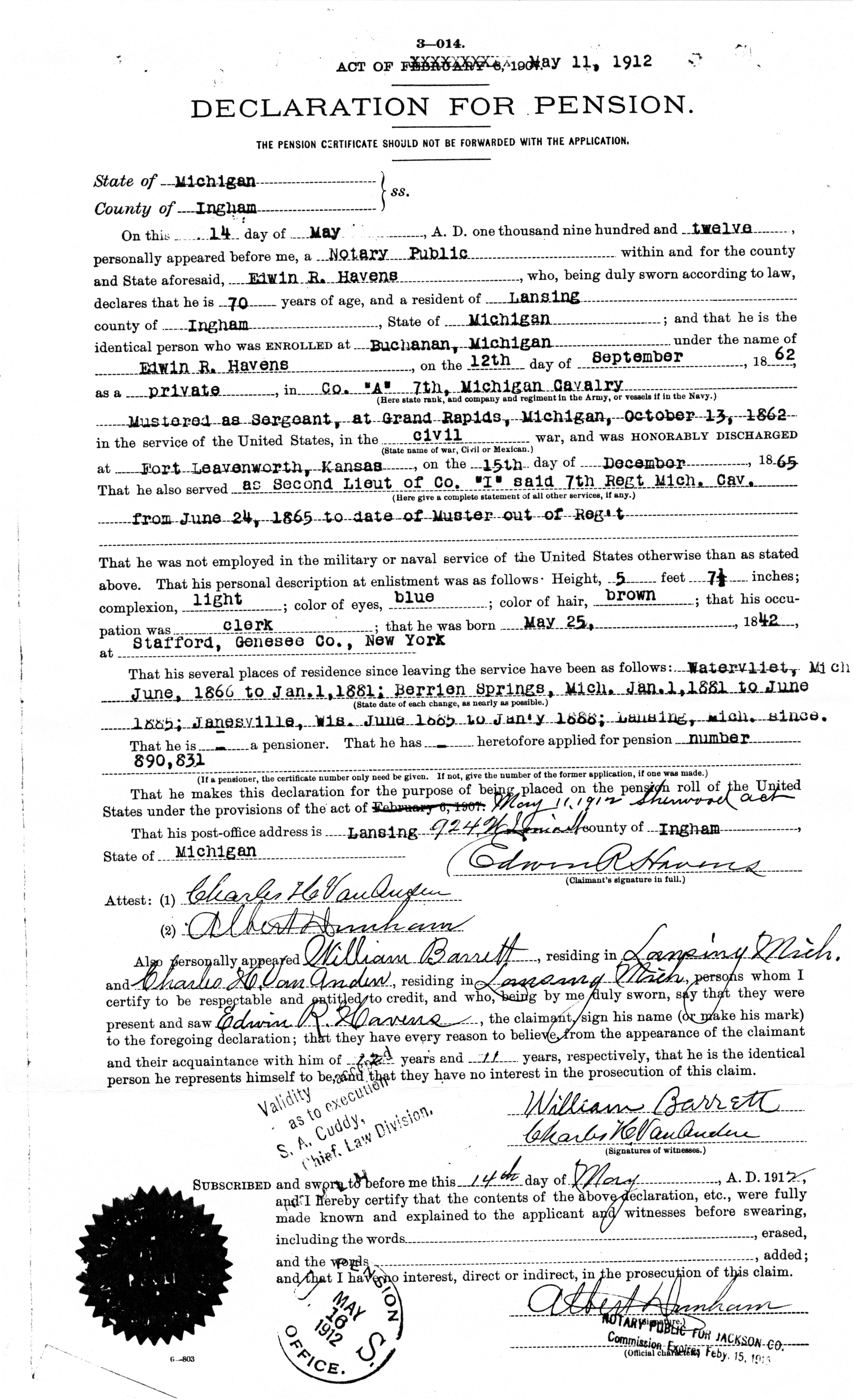 This document is a pension request made by Edwin Havens, under the 1912 Sherwood Act, which made him eligible as a veteran for pension regardless of personal ability.
