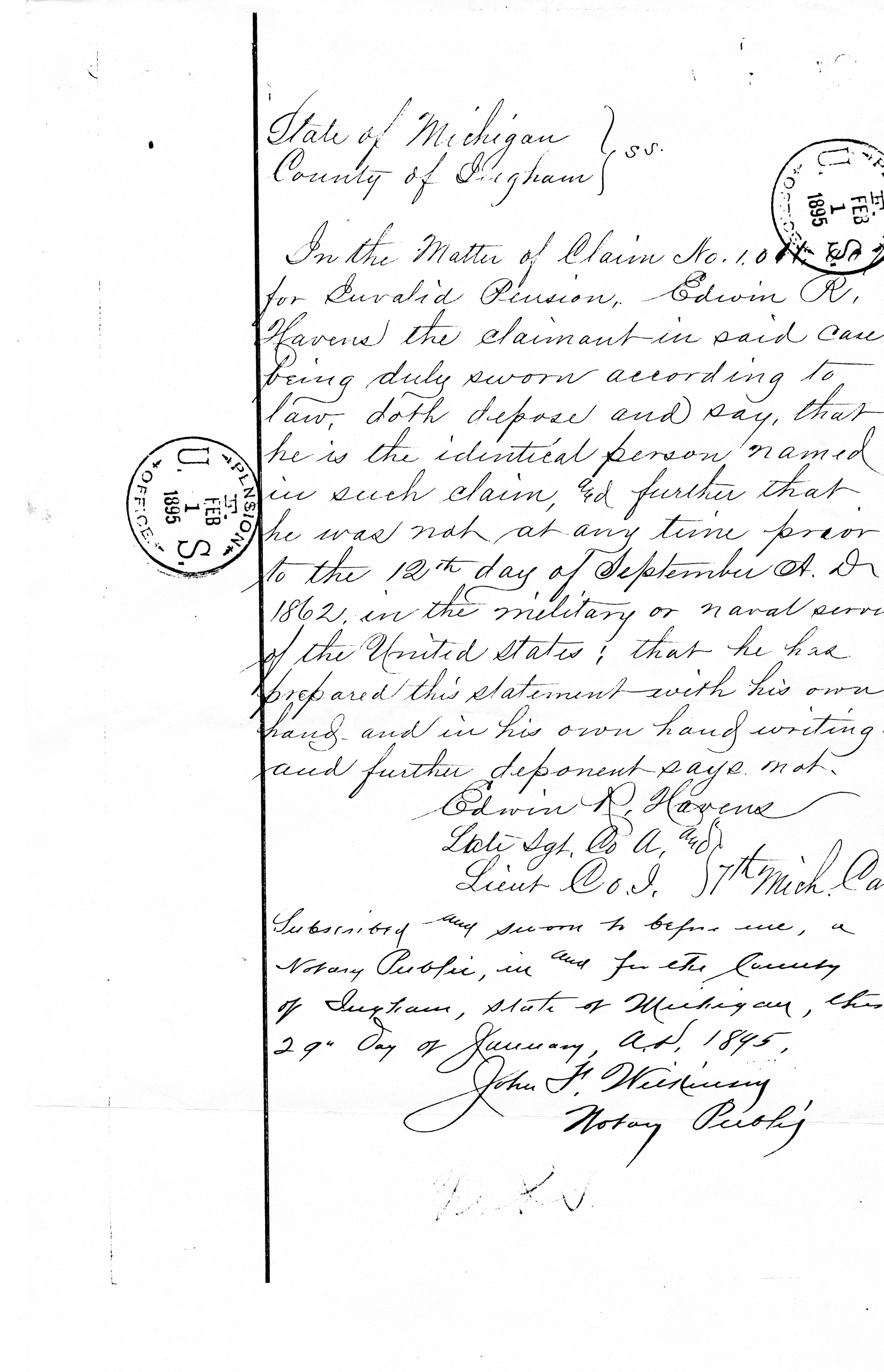 This document was created by a notary of Ingham County to certify that Edwin Havens was in fact his "identical self" and responsible for the Invalid Pension claim.