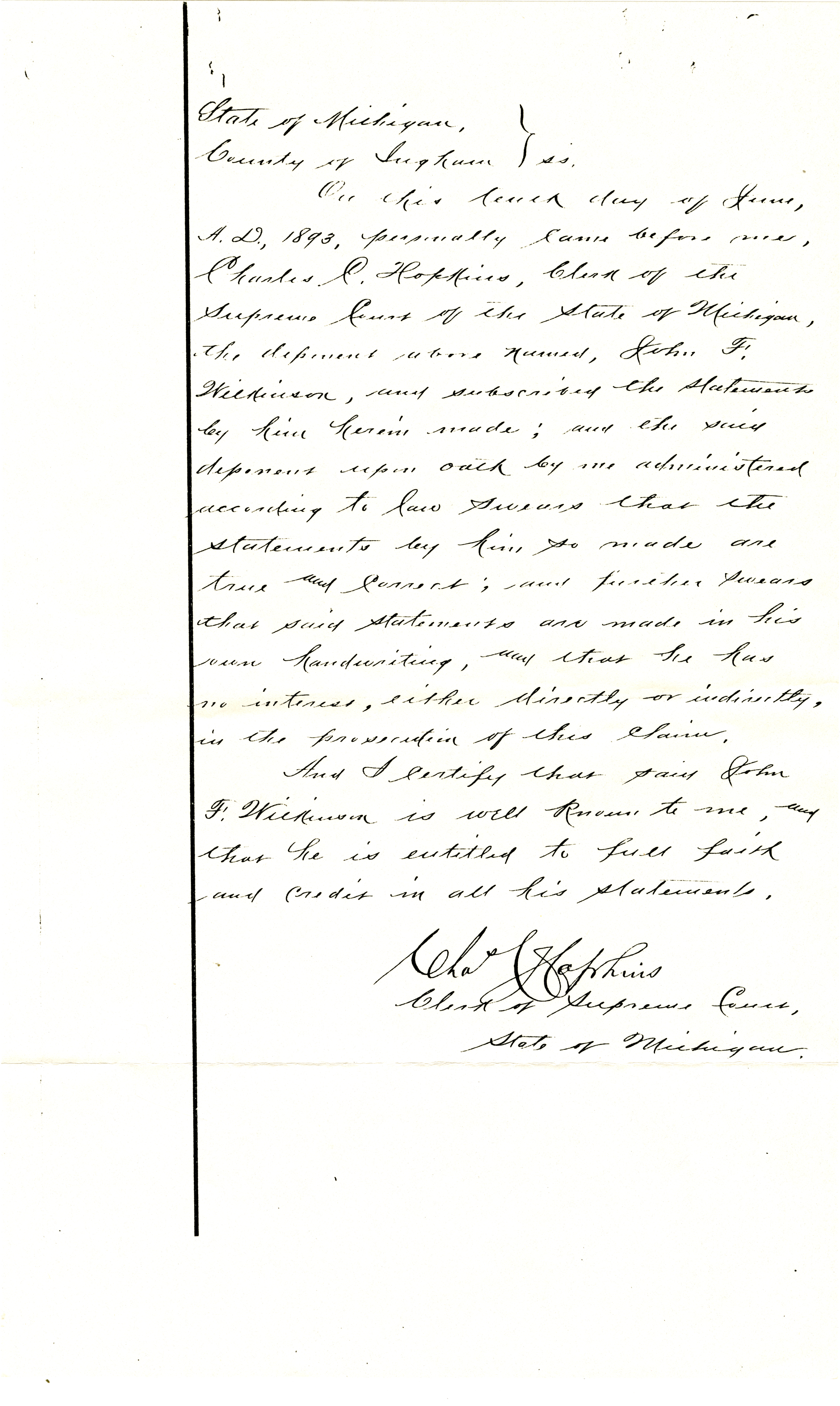 This letter was written to the Bureau of Pensions by the clerk of the Michigan Supreme Court, attesting to the credibility of Edwin Havens and that the letter was written by his own hand.