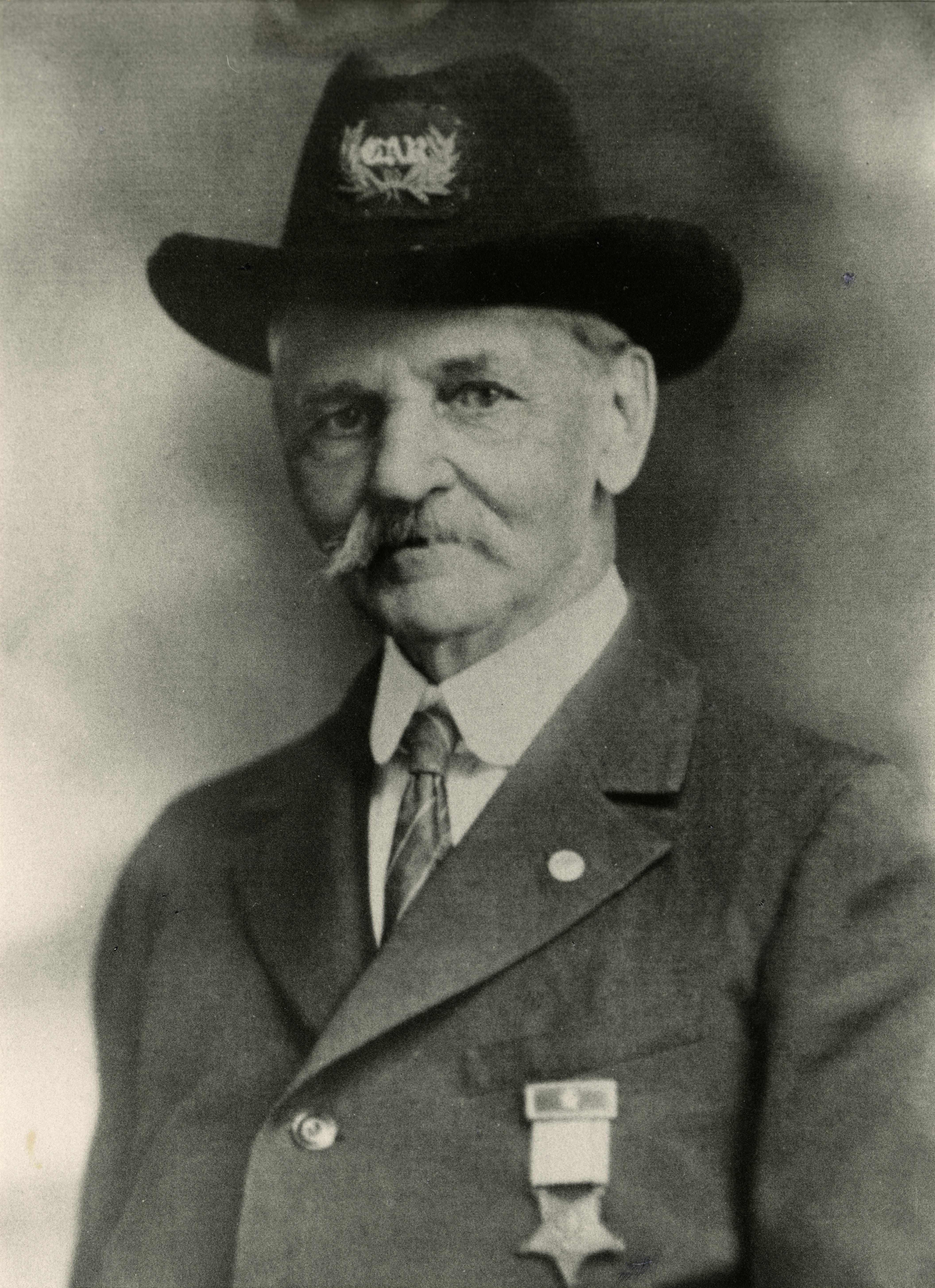 This photograph is a picture of Edwin R. Havens roughly 40 years after his discharge from the Michigan Cavalry. He is seen here with batches and a badge from the Grand Army of the Republic office.