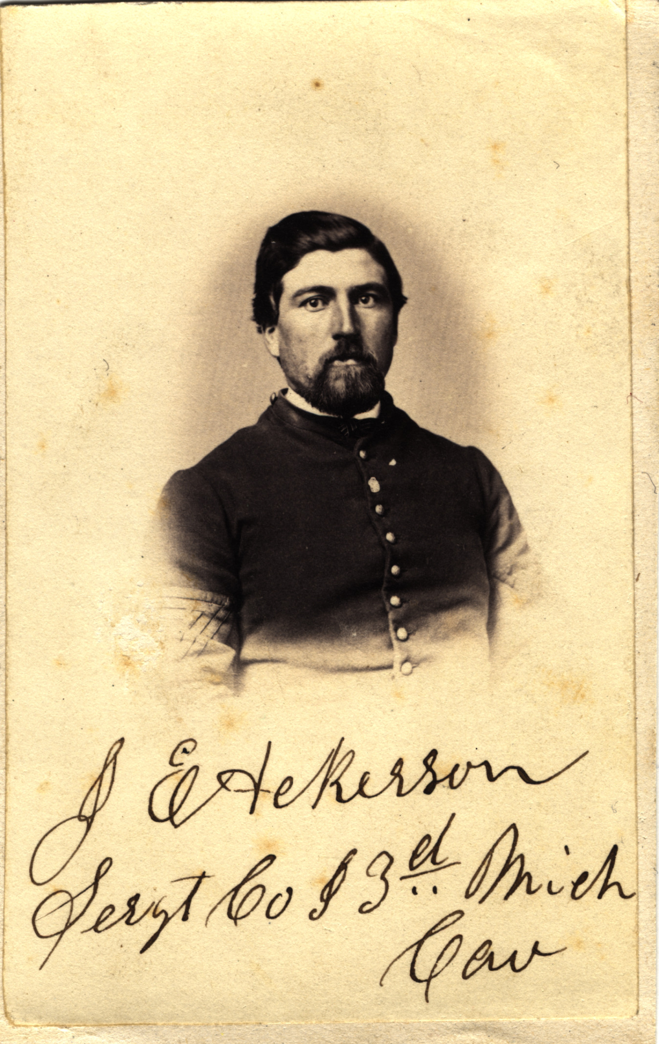 A carte-de-visite format print of John E. Ackerson. He was a sergeant in the 3rd Michigan Cavalry.