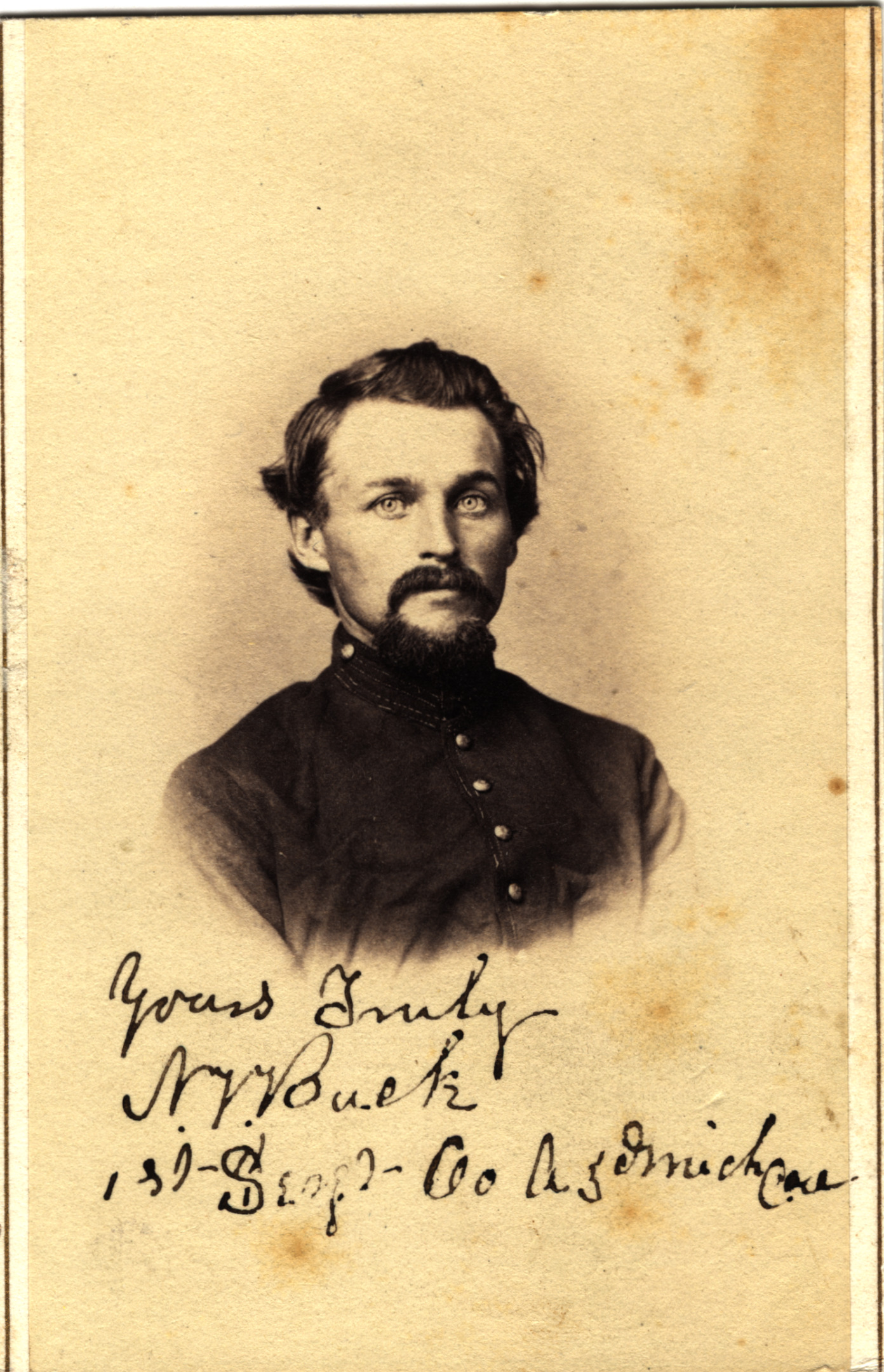 A carte-de-visite print of Nathan V. Buck. He was a member of Company A of the 3rd Michigan Cavalry.