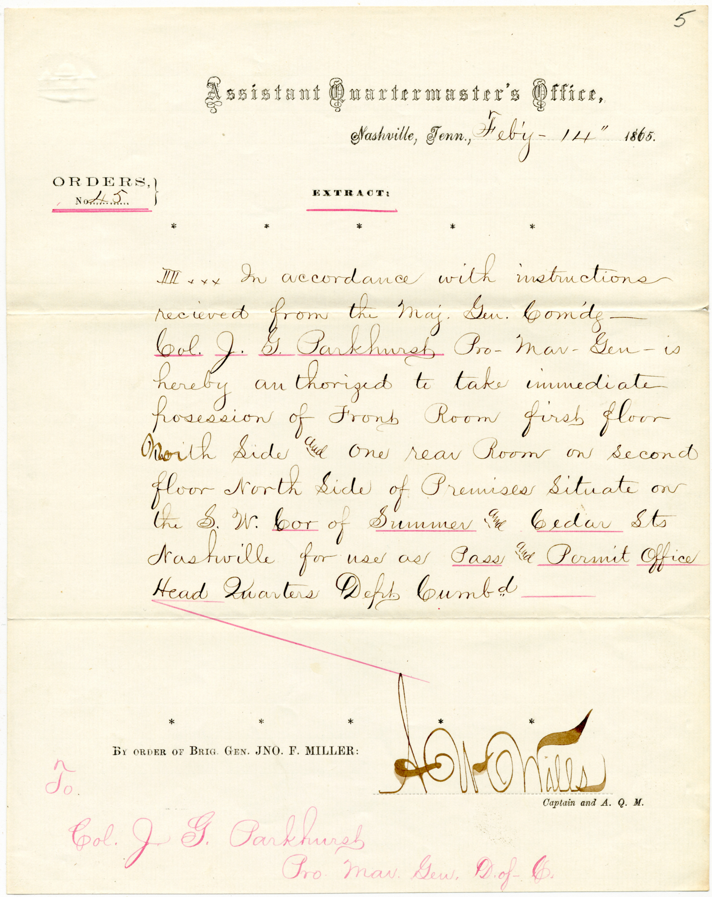 This order authorizes John G. Parkhurst to seize two rooms for use as a Pass and Permit Office.