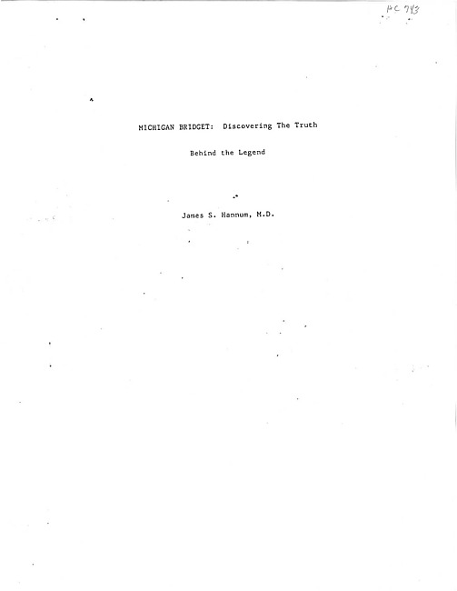 This collection consists of the manuscript entitled "Michigan Bridget: Discovering the Truth Behind the Legend" by James S. Hannum M.D. The manuscript is about Bridget Deavers, a camp follower with the First Michigan Cavalry who acted as a field nurse for the troops. The manuscript investigates her origins, the role she played in the war, and what she did after the war. The manuscript primarily focuses on the years 1862 to 1867. Also included in the manuscript is a bibliography.