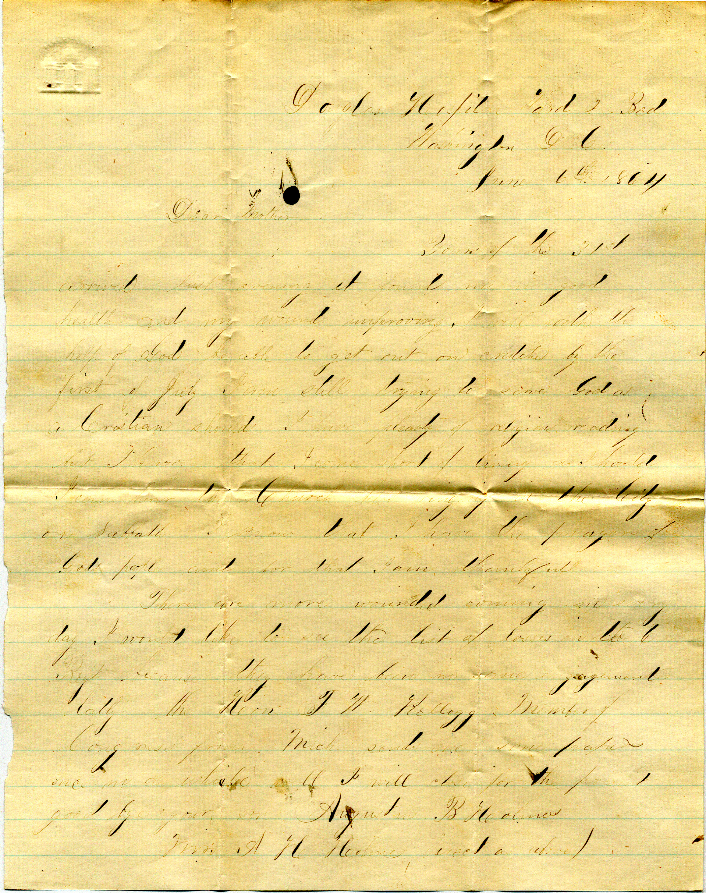 Augustus Holmes tells his mother that his wound is healing and he hopes he can leave the hospital on crutches by July first. He explains that he is trying to be a good Christian because he knows he has not always acted as such.