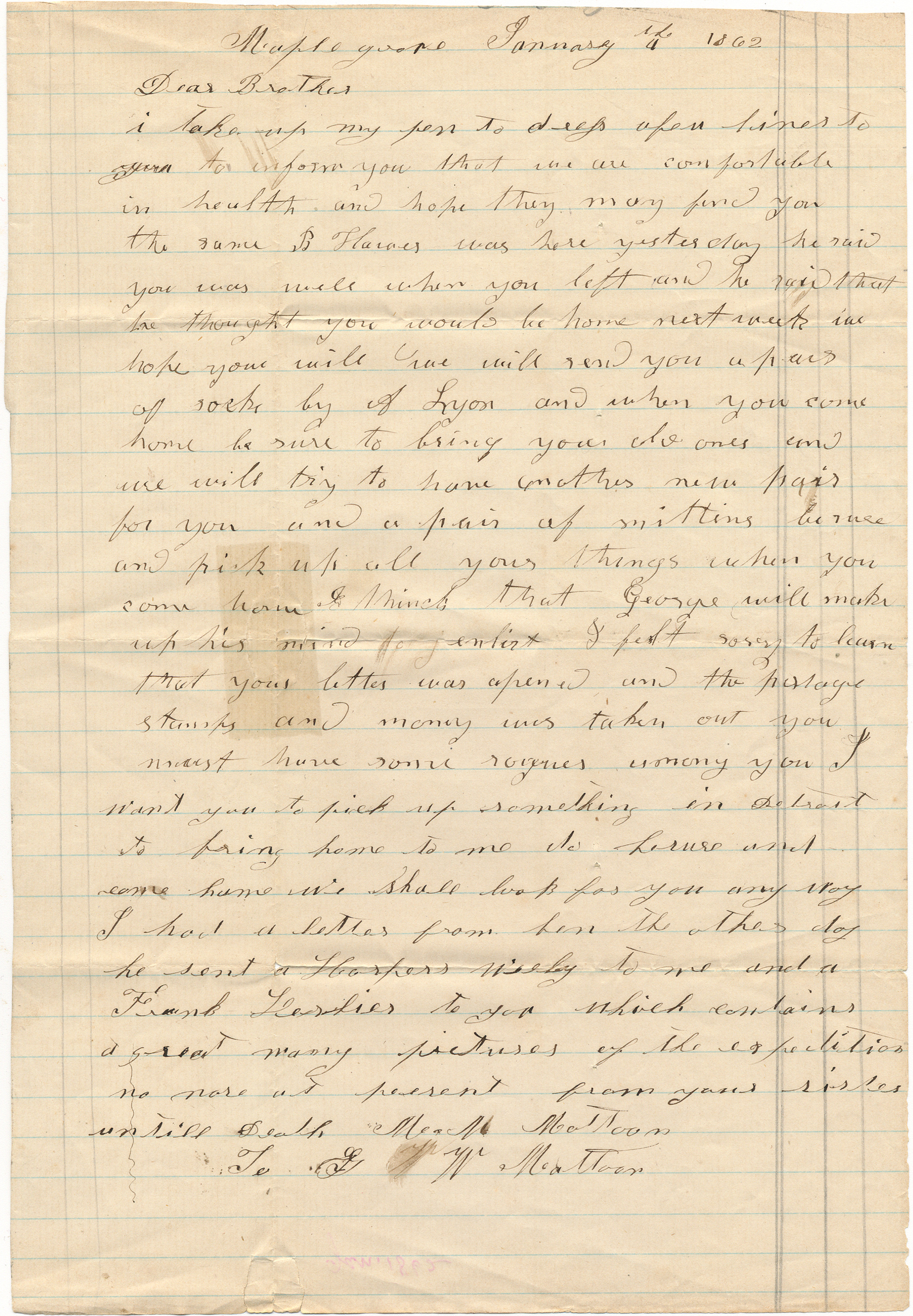 The writer of the letter is a sister of Gershom, but it is not certain which one. Based on the signature, it seems that it is likely Mary Amelia Mattoon. She informs Gershom that they have new socks and mittens waiting for him when he returns home. She also indicates that the cash and stamps contained within Gershom's last letter were stolen.