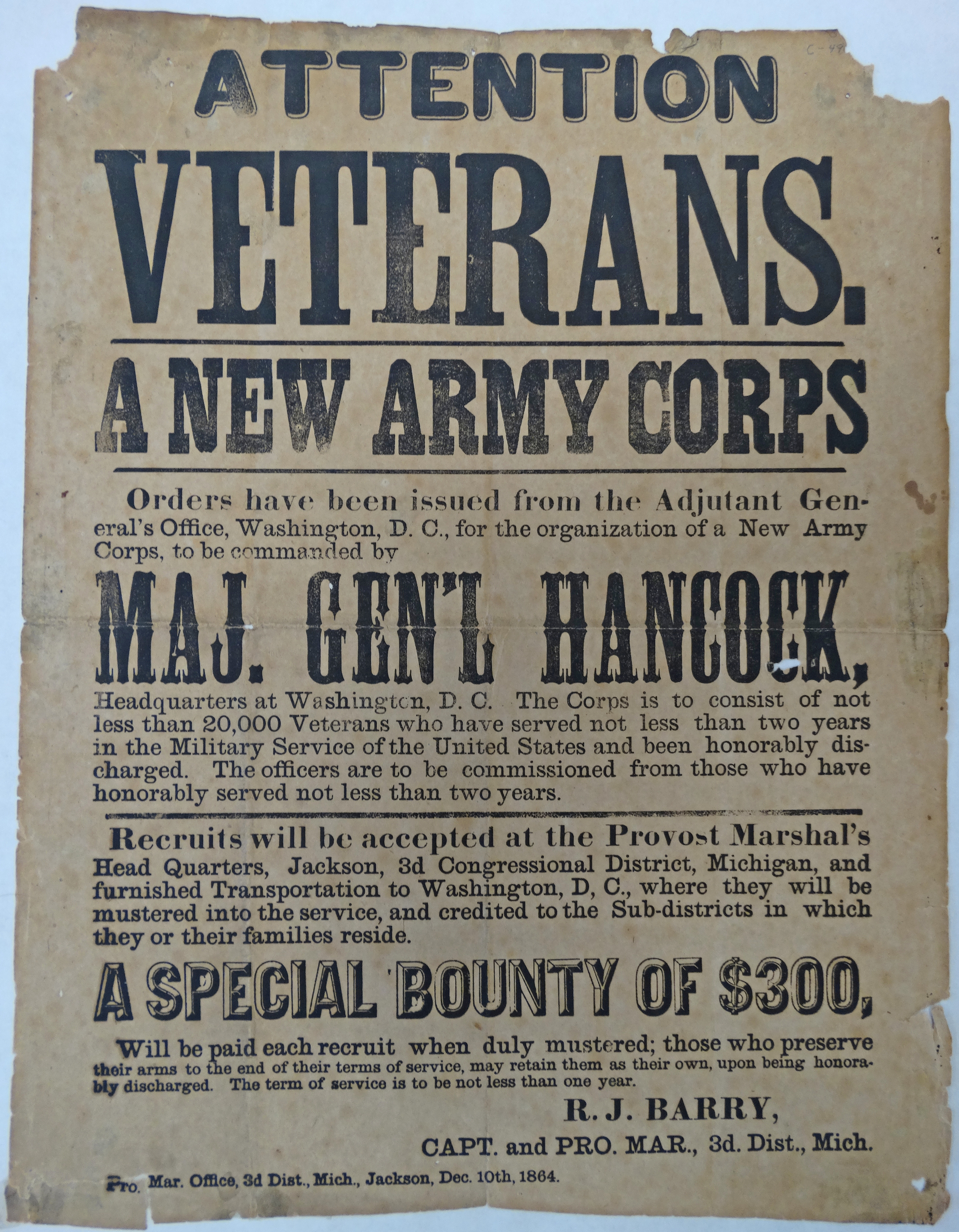 This poster advertises the desire to recruit 20,000 honorably discharged veterans with at least two years of service for a "New Army Corps." that will serve in Washington, D.C. and be paid a $300 bounty.