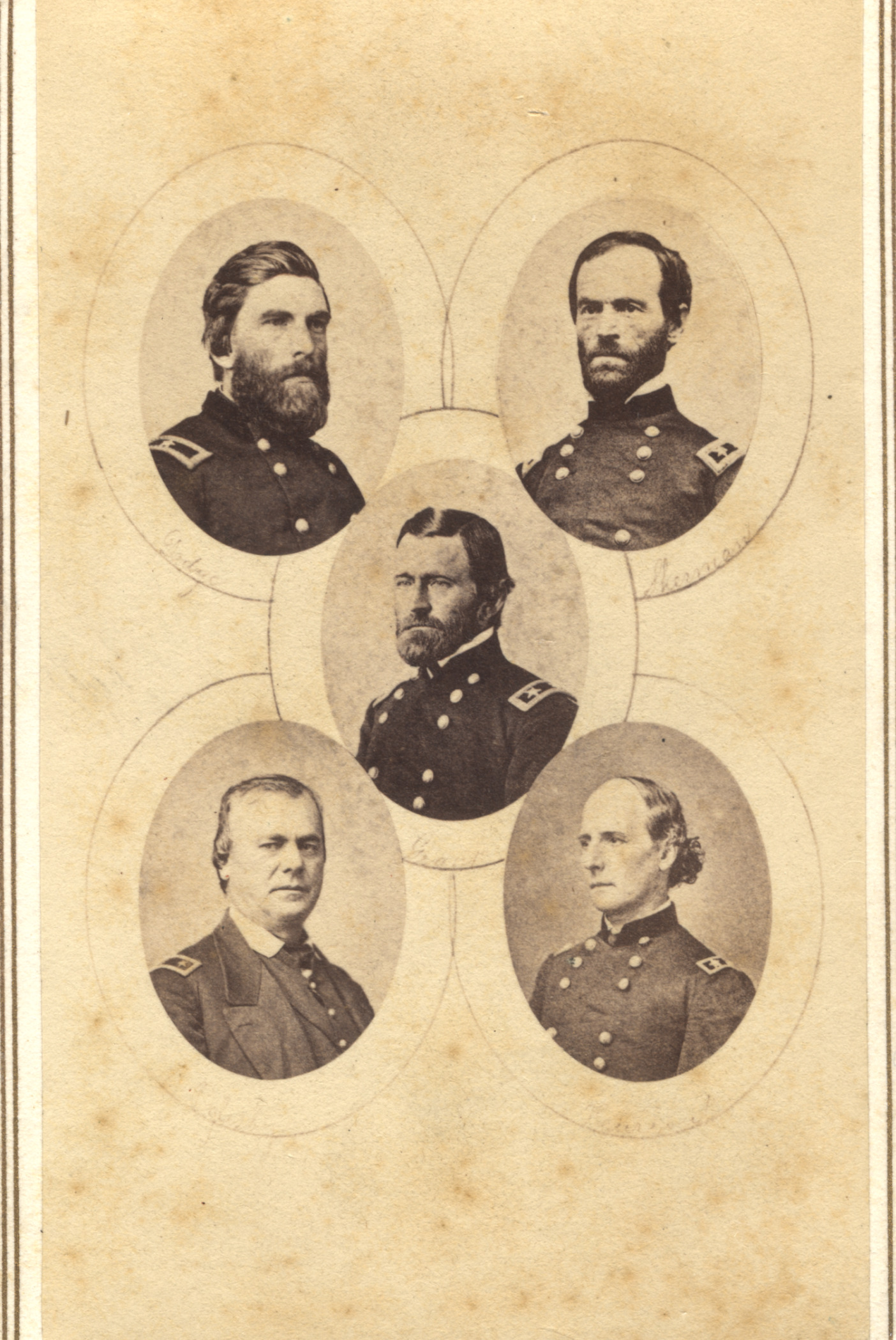 Carte-de-visite of United States Civil War Generals from the United States Civil War period. Includes images of five generals including Grant and Sherman.