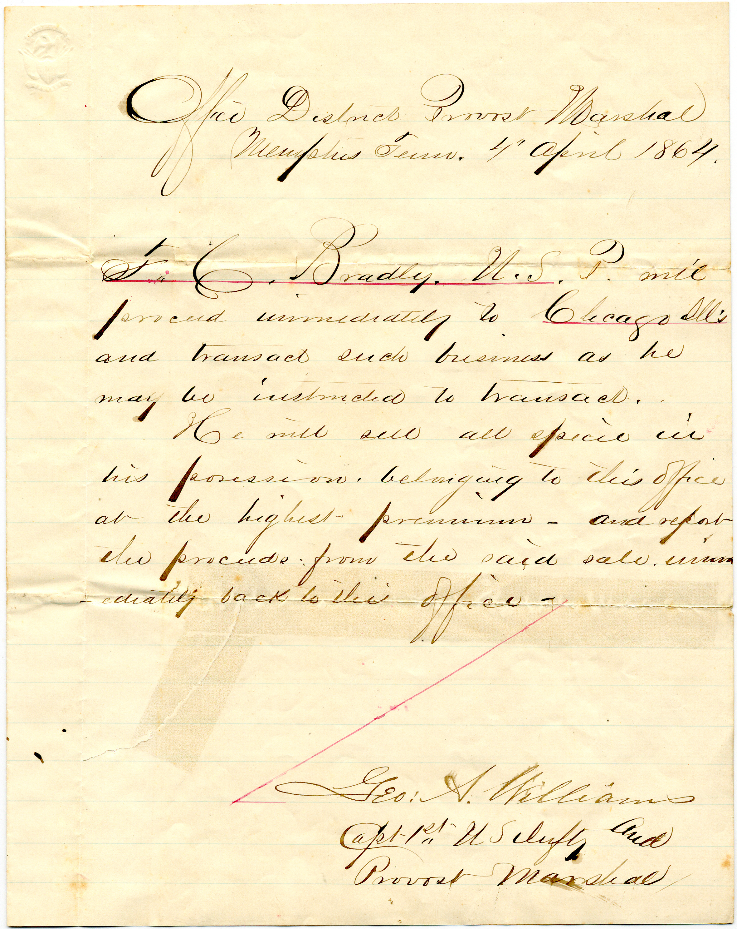 This letter authorizes Thomas to make business transactions in Chicago and report his profits to the U.S. Police office in Memphis. A later letter reveals that he was selling silver and gold.