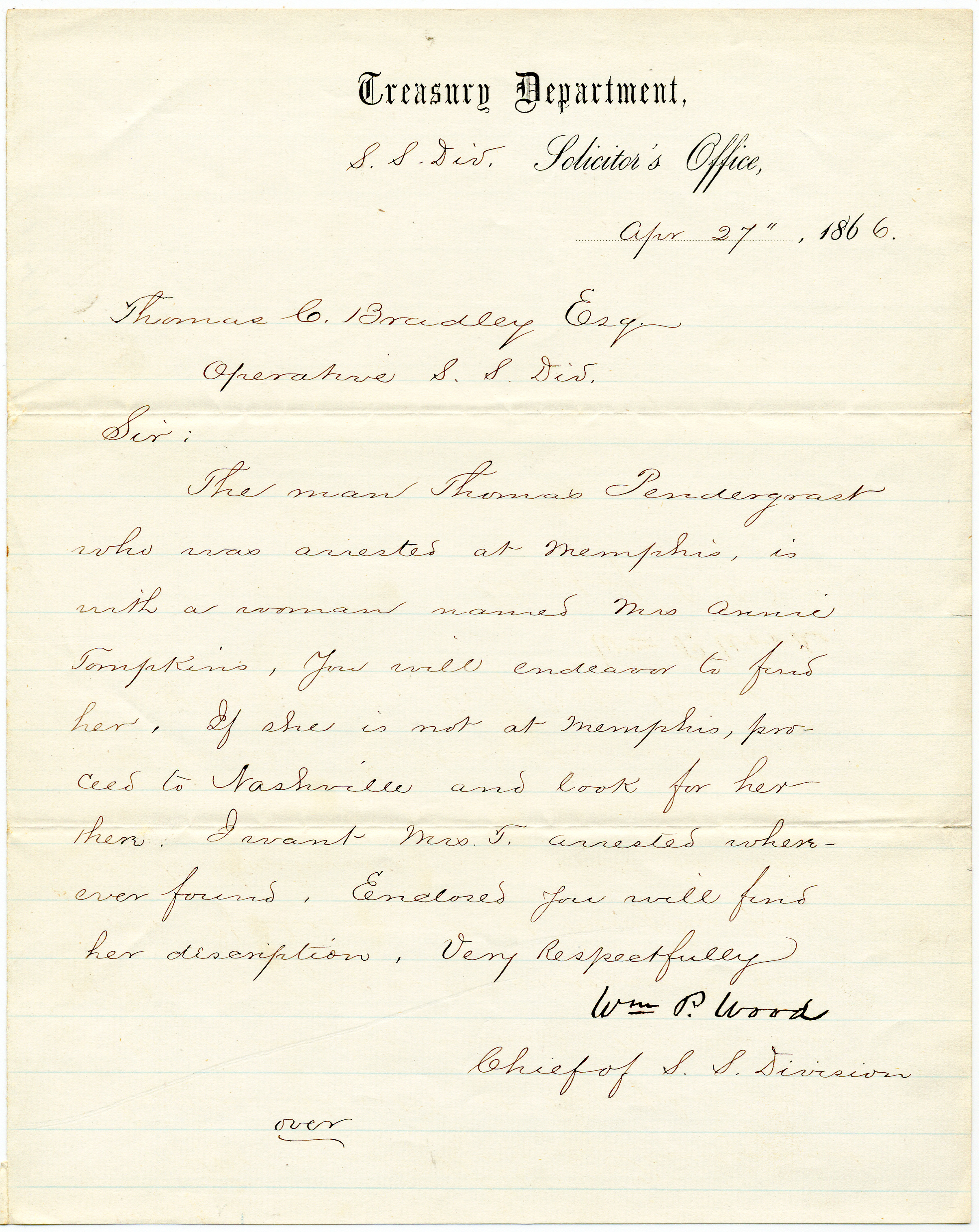 William P. Wood, the first Chief of the Secret Service, asks Thomas to find and arrest a woman named Annie Tompkins for an unknown reason.