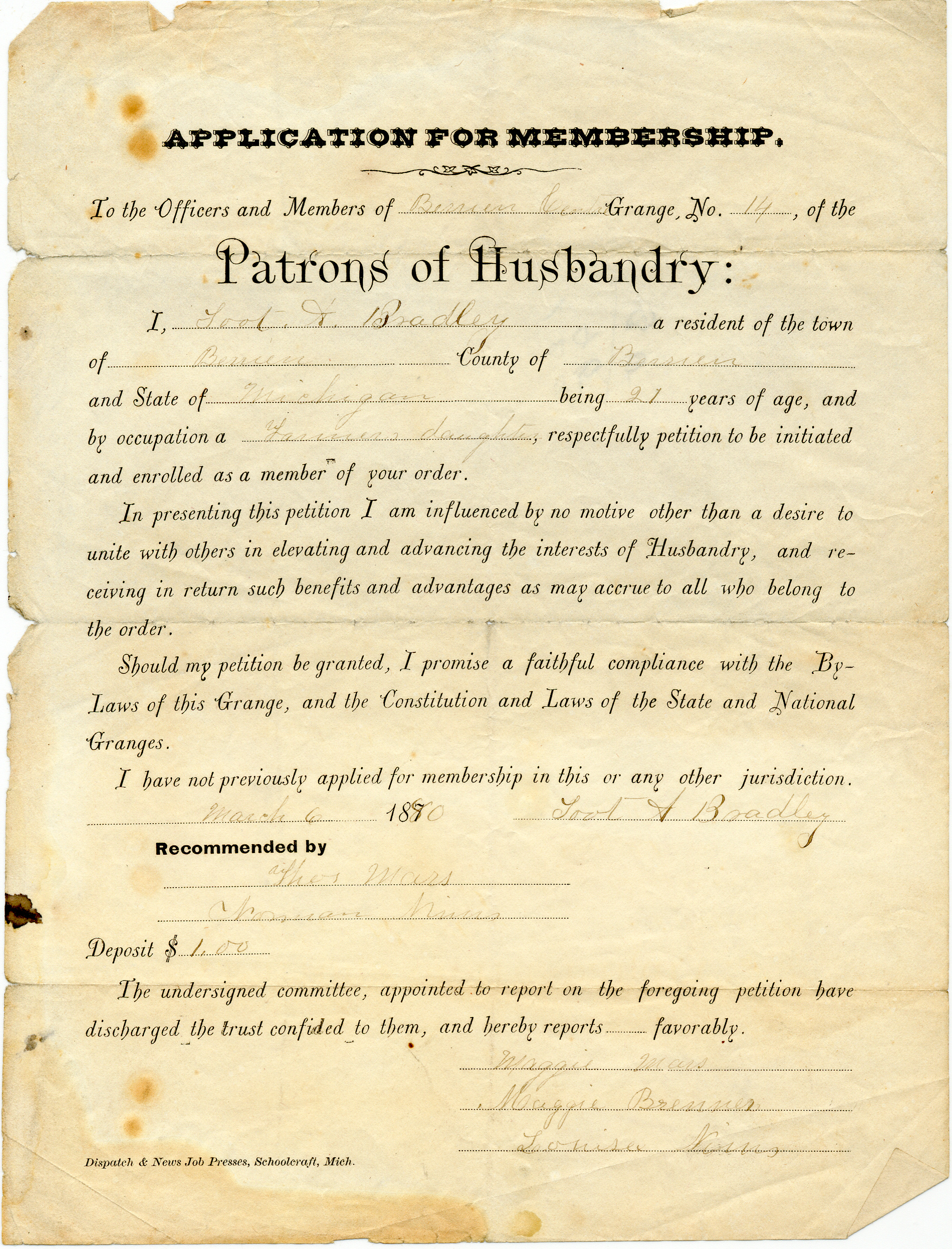 [Loot?] A Bradley applies for membership to the Berrien County chapter of the National Grange of the Orders of Patrons of Husbandry. She lists her occupation as a "farmers daughter" but it is unclear how she is related to Thomas.