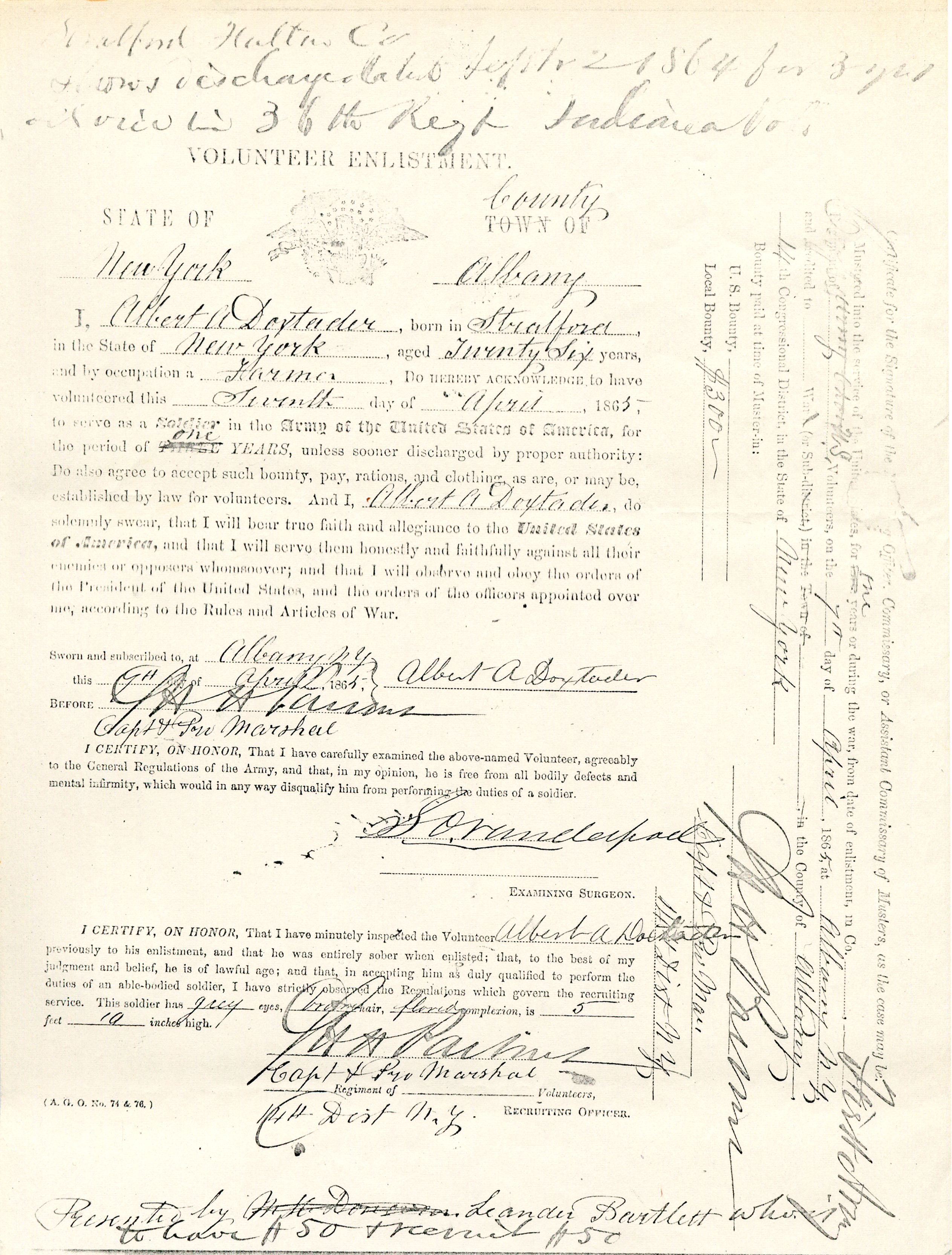 This form indicates that Albert Doxtader enlisted in the First Army Corps of U.S. Volunteers at Albany, New York, on April 7, 1865, for a one-year term of service.