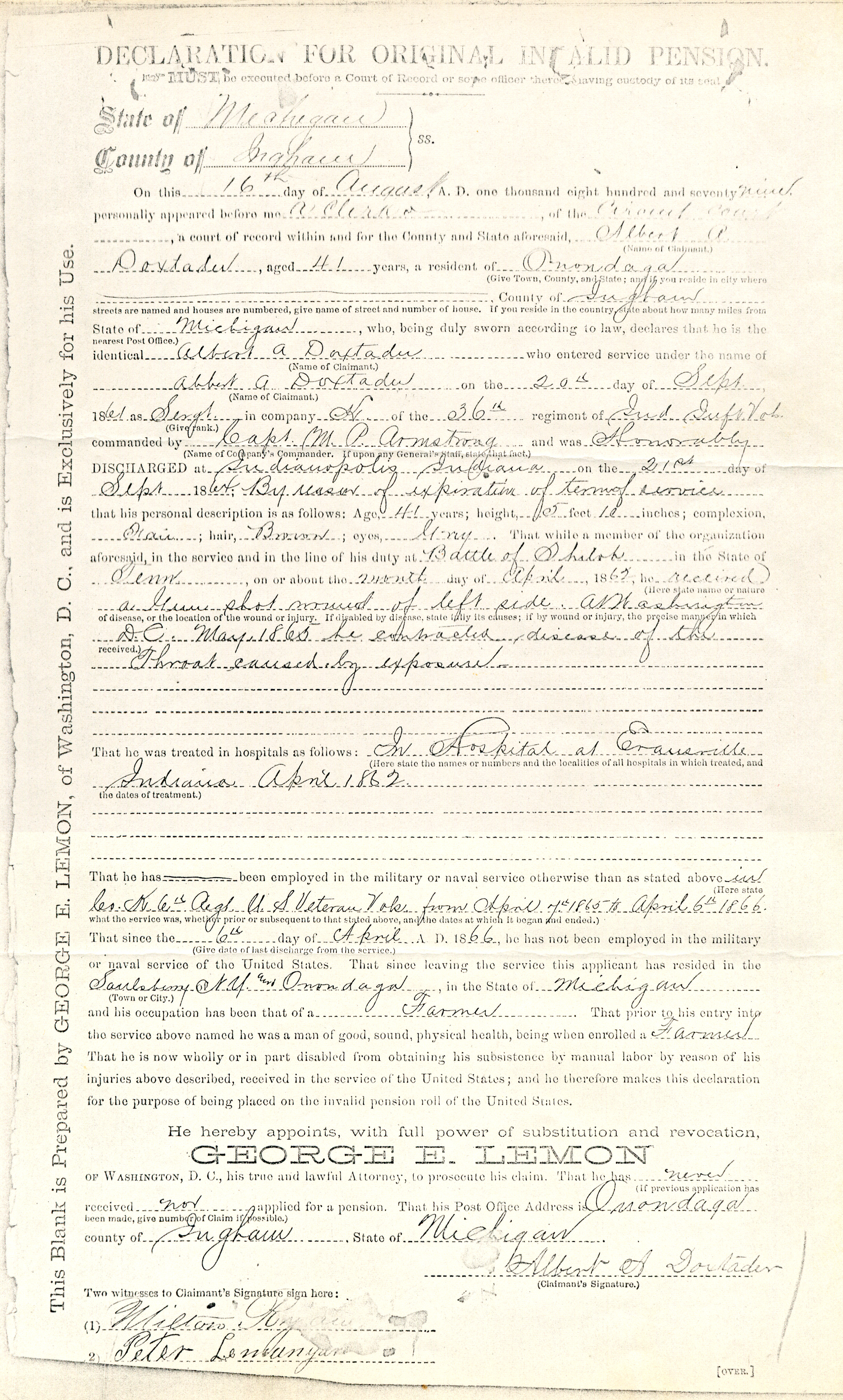 Albert Doxtader Pension Records : Declaration of Original Invalid Pension (August 16, 1879)