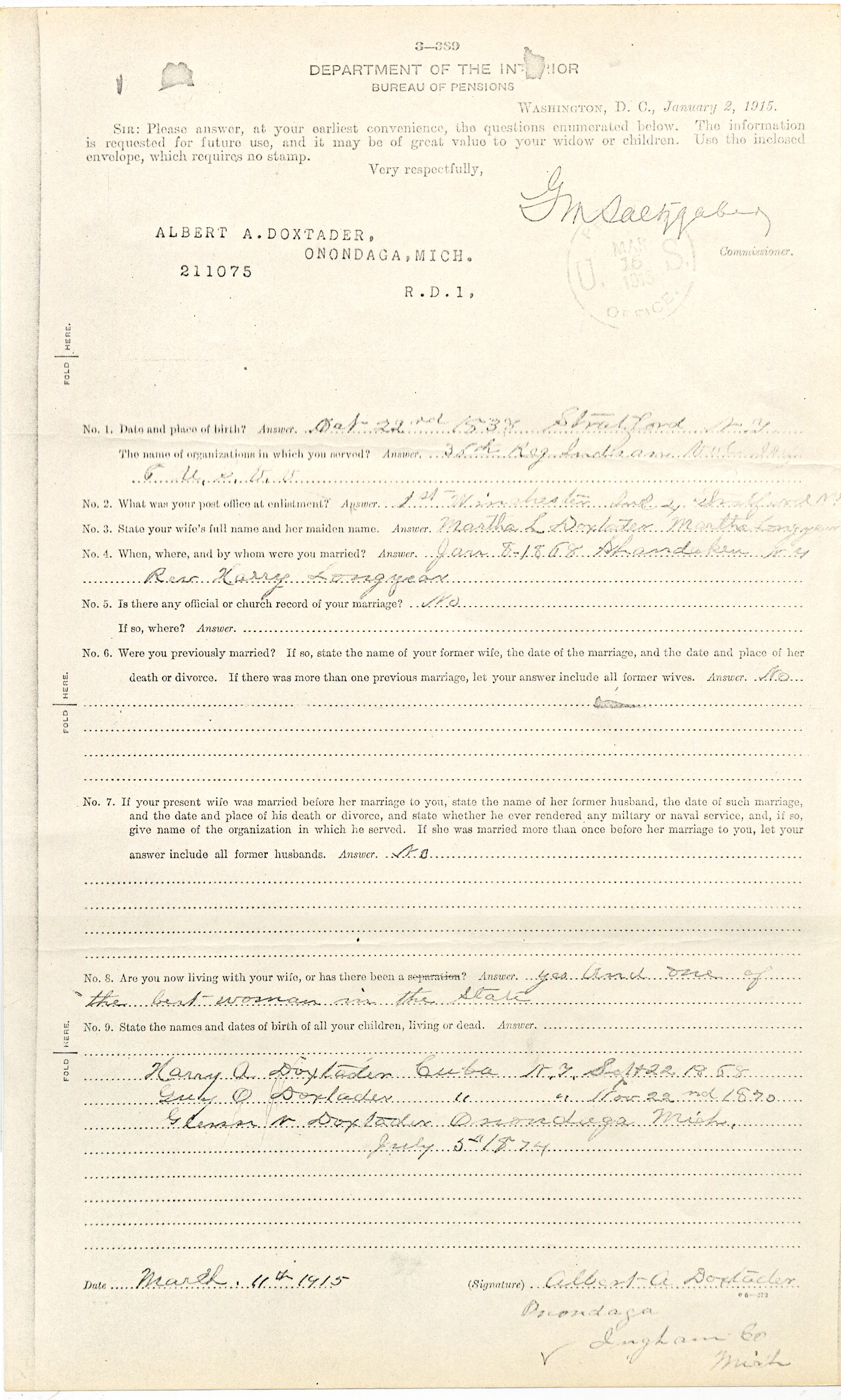 Albert Doxtader Pension Records : Bureau of Pensions Questionnaire (March 15, 1915)