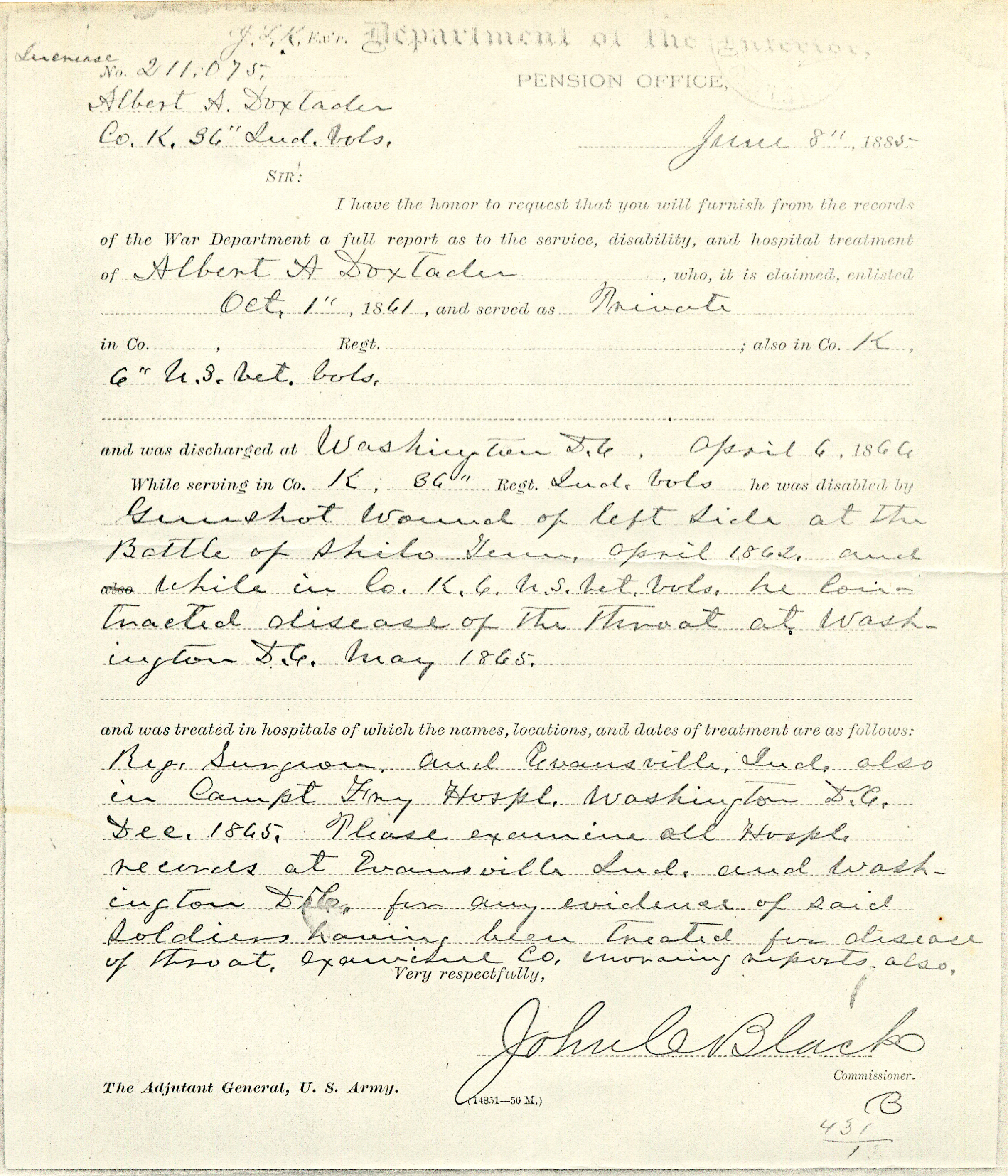The Department of the Interior requests files from the War Department to confirm Albert Doxtader's injury and illness during his terms of service in the Civil War.