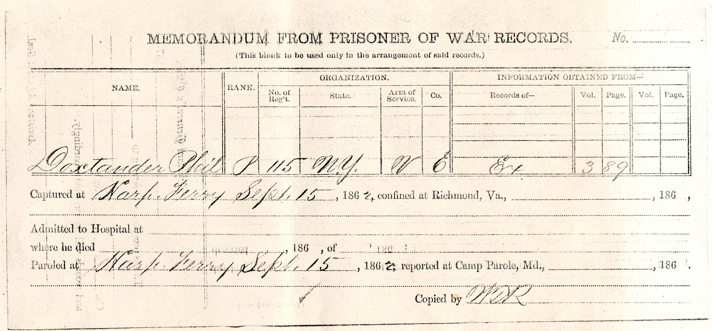 Philander Doxtader Pension Records : Memorandum From Prisoner of War Records