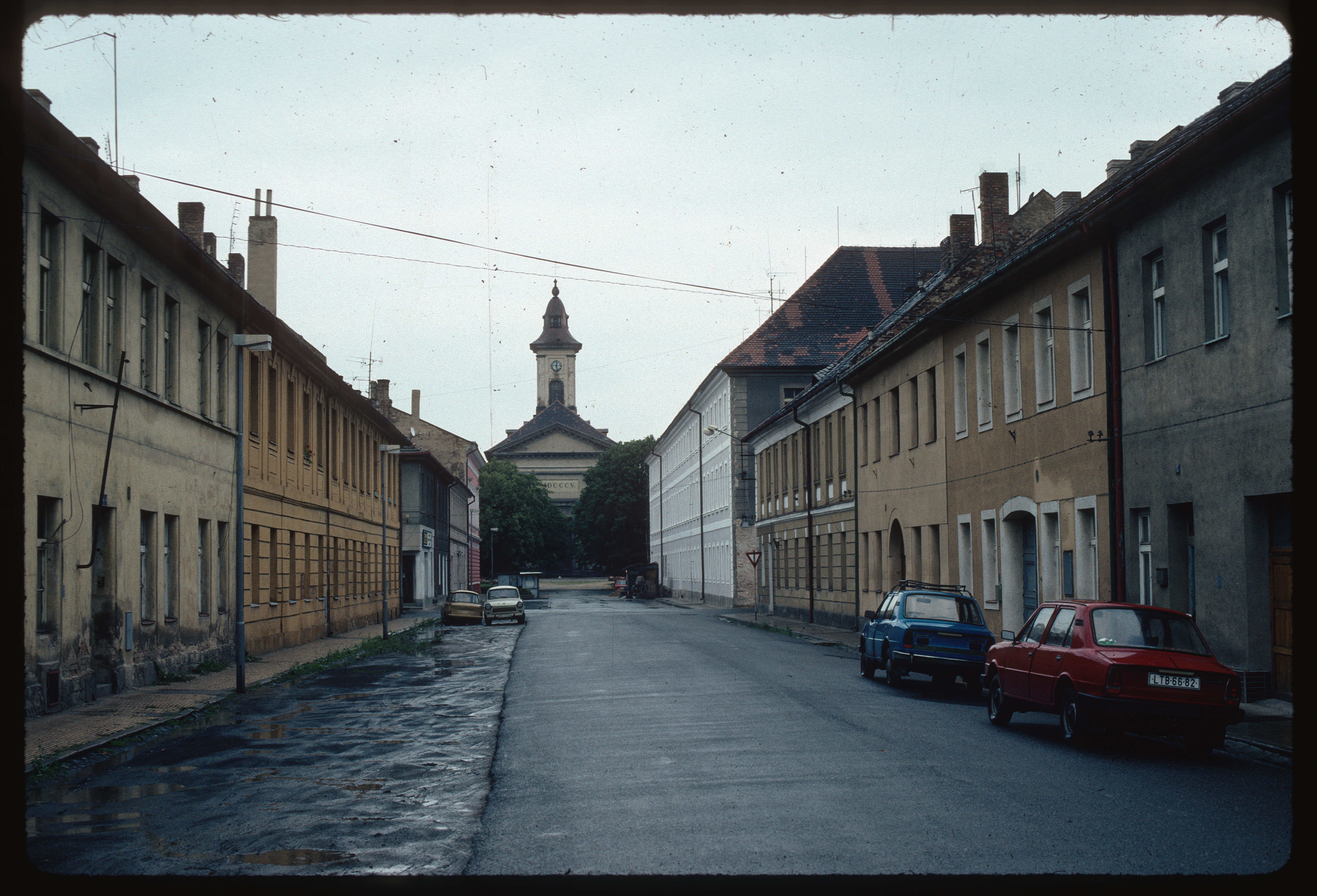 Theresienstadt Concentration Camp : Terezin street scene with church and steeple (for camp context)