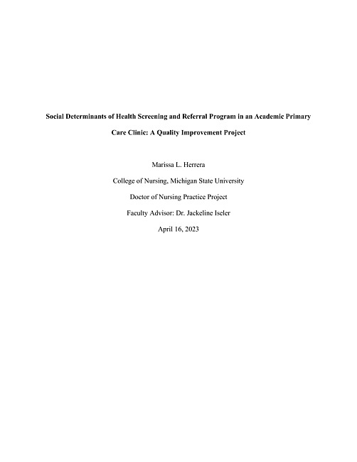 Social determinants of health screening and referral program in an academic primary care clinic : a quality improvement project