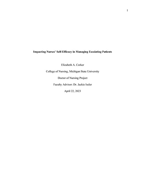 Objective: Violence in healthcare is an ongoing challenge nurses face across the continuum of care. Education on de-escalation techniques and safe disengagement techniques were shown to improve nurses' confidence and ability to de-escalate stressful situations. The purpose of this evidence- based practice project was to determine the impact of an educational session on nurses' self-efficacy in managing escalating patients. Methods: This project utilized a survey of nurses' perceptions of self-efficacy before and after an educational session. Nurses on medical-surgical and telemetry units were invited to participate in the educational session and survey. Demographic information was collected including age, role, education, experience with de-escalation training, and experience with incidences of workplace violence. Results: Thirty-five nurses were surveyed for self-efficacy before and after the educational session, and pre- and post-test values were compared, with a statistically significant improvement in self-efficacy after the intervention. Conclusions: The results of this project indicated that education and training was effective in improving self-efficacy of nursing staff. The education that was effective included recognizing worsening or escalating behavior, appropriate interventions to reduce escalation, as well as how to manage violent behavior safely and effectively through disengagement techniques. Together these provided the knowledge and skills to empower nurses to address these stressful situations and give them the tools to prevent patients from becoming violent.