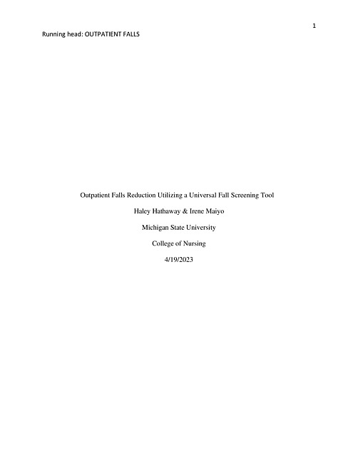 Background: Outpatient falls result in injuries and hospitalizations that generate billions of dollars in medical costs annually. Adults aged 65 and older are the group most frequently affected by falls. Changes in healthcare status, decreasing eyesight, strength, and mobility issues can all contribute to issues for this patient population. One proven way to help decrease falls is identification and intervention with at-risk individuals. The use of a universal screening tool is an efficient and effective way to identify patients who are at-risk for falling or have already fallen and require interventions to avoid future falls. Purpose: The purpose of this quality improvement project is to identify older adults who are at risk for falls through utilization of a universal fall screening tool. Methods/Implementation/Plan/Procedure: The project was implemented at Michigan State University Health System Family Medicine Clinic. Clinic staff were educated on the CDC STEADI fall screening tool, flyers were used as reminders in the clinic, and an implementation staff "champion" was identified and utilized. Older adults were screened for fall risk using the CDC STEADI fall screening tool and flagged within the electronic health record. Use of the STEADI fall screening tool in older adult patients and appropriate flagging of at- risk patients were evaluated as the primary outcomes. Fall incidence and fall-related injuries are among the secondary outcomes. Implications/Conclusion: Identification of at-risk older adults using a universal screening tool is an appropriate and cost-effective approach to prevention and reduction of falls and fall-related injuries in older adults.