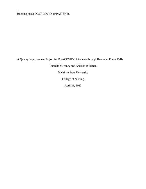 Background and Review of Literature: COVID-19 is a devastating illness that has detrimental health, financial and emotional consequences. Healthcare providers are utilizing questionnaires such as the PROMIS-29 form to help guide management of long term symptoms. Calling patients prior to their appointment as a reminder to complete their forms has proven to increase patient compliance with form completion. Purpose: The purpose of this quality improvement project was to increase the PROMIS-29 form response rate prior to the COVID-19 recovery care appointment, in hopes of improving care for patients living with post-COVID-19 conditions. Methods: This project was implemented at a large Midwest healthcare organization's primary care clinics. The Doctor of Nursing Practice (DNP) students called patients within 72 hours prior to their appointment, to remind them to complete the PROMIS-29 form on their MyChart portal. Implementation Plan/Procedure: The DNP students completed HIPAA training and utilized a script provided by the large Midwest healthcare organization when calling patients. A weekly report was provided by the community partner that includes a list of patients who needed to be called, according to the "post COVID follow up" visit type. The DNP students traveled to the large Midwest healthcare organization's administration building to conduct phone calls. Pre-intervention and post-intervention surveys were sent to the providers to determine the success of the intervention. Implications/Conclusion: Various project limitations impeded the ability to determine the success of the intervention however, the project proved helpful in determining that other reminder modalities may be of benefit to explore in the future. Keywords: Patient, Remind, Phone, Text, Email, Call, Form, Paperwork.