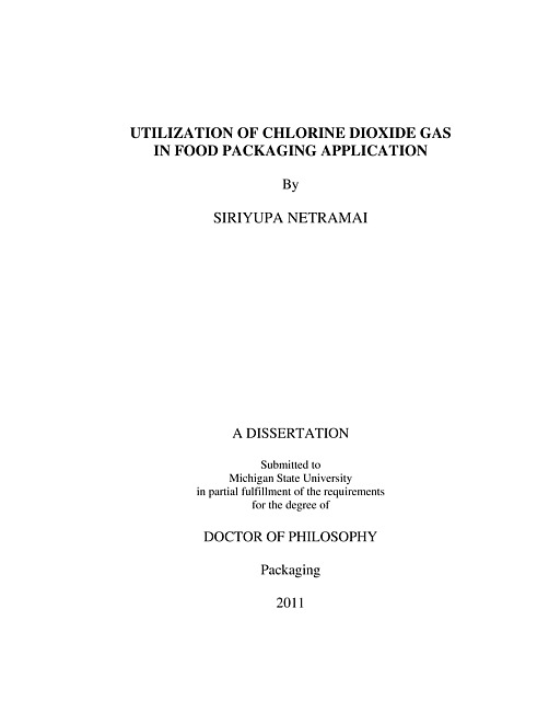 UTILIZATION OF CHLORINE DIOXIDE GAS IN FOOD PACKAGING APPLICATIONBySiriyupa NetramaiChlorine dioxide (ClO2) in its gaseous form has been utilized in numerous studies for vapor-phase decontamination, both in treating the produces before packaging, and sanitizing the products inside their packages. Yet, very little is known about its compatibilities with packaging materials, as well as its performances as affected by food packaging system.In this study, mass transfer profiles (permeability, solubility and diffusion coefficients) of ClO2 for 10 types of polymeric packaging materials were determined by an isostatic method using a continuous system for measuring ClO2 concentration with an electrochemical sensor as a detector. The study showed that PET, PLA, BOPP, nylon, and multilayer of EVA/EVOH/EVA have high ClO2 barrier, while PS, LLDPE, LDPE, HDPE, and PVC have low barrier to ClO2. Effects of gaseous ClO2 on physical, mechanical, chemical, and barrier properties of polymeric packaging materials were also studied by exposing selected materials to ClO2 gas. After 14 days of exposure, significant changes, such as increases in barriers to O2 and CO2 of nylon, changes in permselectivity (PCO2/PO2) ratio of up to 46.8% in treated PE, PS, PET, and nylon films, and changes in FT-IR spectra of PET, PLA, and EVA/EVOH/EVA, indicate possible changes in chemical profiles and performance of the materials. Study on influences of packaging design on sanitizing effect of ClO2 gas, on shredded Romaine lettuce, indicated that minimizing the distance between gas releasing spot and target surfaces, as well as, maximizing gas releasing surface could significantly improve antimicrobial activity of ClO2 gas in particular packaging system. Once the interior of the package was optimized, it was observed that the amount of ClO2 gas used per package could be reduced to half of its original dose, and still achieved the same level of log10 CFU reduction of Escherichia coli O157:H7 in packaged shredded lettuce.Once ClO2 is in contact with food products, it will decontaminate the surfaces, as well as being absorbed by the product. The latter amount could not be accounted for its sanitizing capacity. Study on absorption behaviors of Romaine lettuce showed that increasing ClO2 level and/or time of exposure increased residual ClO2 and chlorite (ClO2-) recovered from lettuce sample. The presence of cuts significantly increased the amount of ClO2 consumed, while exceed water did not increased ClO2 absorption by lettuce.The research approach could be of great importance when considering antimicrobial packaging with ClO2 gas as a safety measure. Information generated could also be used to generate parameter for computational modeling of packaging systems.