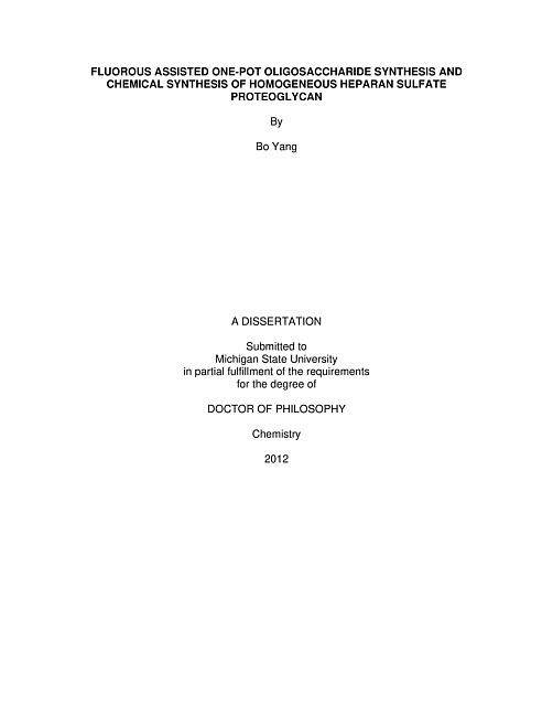 Pre-activation based glycosylation is a powerful method for synthesizing bioloigically important oligosaccharides. Chapter 1 summarized the progress in this area in recent years. This approach has unique characteristics compared to traditional oligosaccharide synthetic methods. This chapter discussed its chemoselectivity and stereoselectivity in details. Pre-activation based iterative one-pot synthesis greatly accelerated the oligosaccharide assembly process. To further improve the overall synthetic efficiency, we developed a new method which was described in Chapter 2. This new method combines one-pot synthesis and fluorous separation. After one-pot glycosylation is complete, a fluorous tag is introduced into the reaction mixture to selectively "catch" the desired oligosaccharide to form fluorous tagged product, which is isolated from other impurities by fluorous solid phase extraction (F-SPE). Followed by "release" and another "F-SPE", the purification of desired product is achieved. A trisaccharide and a tetrasaccharide are synthesized using this method. Hpearan sulfate proteoglycans (HSPGs), including syndecans and glypicans, are ubiquitous components of mammalian cell surface and extracellular matrix and they play important roles in various biological processes such as cancer development, angiogenesis. viral infection and wound repair. They are composed of heparan sulfate (HS), tetrasaccharide linkage and core protein and increasing evidence shows both HS and core protein can direct the function of HSPGs. To establish structure-activity relationship, it is important to obtain homogeneous HSPGs. However, naturally existing HSPGs are higly heterogeneous and chemical synthesis has never been reported. To address this issue, we chemically synthesized the ectodomain of human syndecan-1. Chapter 3 described an efficient synthetic route which has been established to synthesize a HS bearing glycopeptide. The success of the synthesis will lay the foundation for accessing other proteoglycan structures.