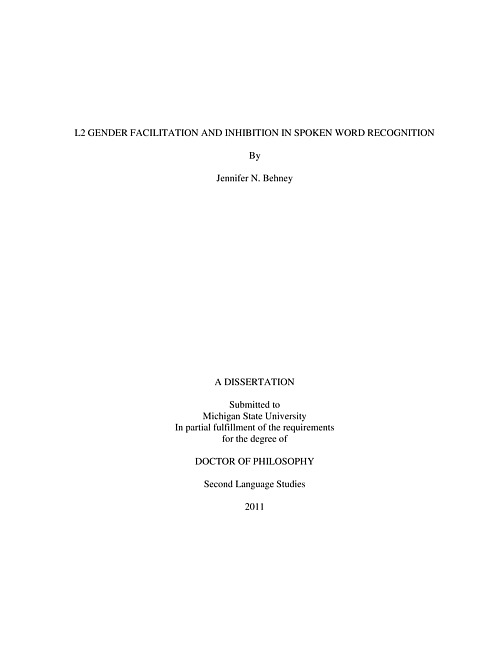 This dissertation investigates the role of grammatical gender facilitation and inhibition in second language (L2) learners' spoken word recognition. Native speakers of languages that have grammatical gender are sensitive to gender marking when hearing and recognizing a word. Gender facilitation refers to when a given noun that is preceded by an adjective with the same gender marking (e.g., in Italian, bella casa "beautiful Feminine Adjective house Feminine Noun") is recognized more quickly than if the noun is preceded by an adjective that does not have a gender marking (e.g., grande casa "big Neutral Adjective houseFeminine Noun"). Gender inhibition refers to when a noun that is preceded by an adjective that has the wrong gender marking (e.g., *bello casa "beautiful Masculine Adjective house Feminine Noun") is recognized more slowly than if the noun is preceded by an adjective that does not have a gender marking (e.g., Bates, Devescovi, Hernandez, & Pizzamiglio, 1996; Dahan, Swingley, Tanenhaus, & Magnuson, 2001; Davidson, de la Fuente, Montrul, & Foote, 2011; Guillelmon & Grosjean, 2001). Effects of gender facilitation and gender inhibition among late second language (L2) learners are less strong than those found among native speakers (Davidson, et al., 2011; Foote, 2011) or nonexistent (Guillelmon & Grosjean, 2001). These earlier L2 studies, however, examined only learners whose first language (L1) was English, which does not have grammatical gender. In this study I compare the spoken word recognition of L2 learners with gender in the L1 to those without gender in the L1 in three different tasks (which differed in terms of automatic versus controlled processing) in order to investigate gender facilitation and inhibition in the L2 and how it is affected by the type of task and the transparency of the gender marking on the noun. A control group of 24 native speakers and 72 advanced learners of Italian divided in 3 experimental groups completed the three spoken word recognition tasks. The learners were placed into one of the 3 groups on the basis of gender in the L1: (a) Romance L1s that have gender systems similar to that of Italian (e.g., Spanish); (b) L1s that have gender systems different from that of Italian (e.g., Russian); and (c) L1s that do not have gender (e.g., English). The participants listened to adjective-noun combinations and responded by (a) repeating the noun, (b) by identifying the gender of the noun, or by (c) indicating the grammaticality of the adjective and the noun together. The response times and the accuracy of the participants' responses were recorded and analyzed with mixed measures ANOVAs and t tests. I predicted that the native speakers and all of the learners would show effects of inhibition in the more controlled explicit tasks and that the transparency of the gender of the noun would affect the speed with which they identified the nouns. I predicted that only the native speakers and the L1 Romance learners would show effects of facilitation and/or inhibition in the implicit, less controlled task. The results showed that learners of Italian who have Romance gender in the L1 are similar to native speakers in their processing of gender in the L2. Learners who have another (non-Romance) gender system in the L1 pattern more similarly to learners who do not have any gender in the L1, at least in controlled processing tasks. All participants were influenced by the transparency of the gender on the noun, but native speakers and L1 Romance learners were less affected than the other two learner groups. The findings are discussed in terms of the role that gender plays in the lexical access of L2 learners and how it differs from that of native speakers. The findings are also discussed in terms of implications for L2 acquisition of grammatical gender.
