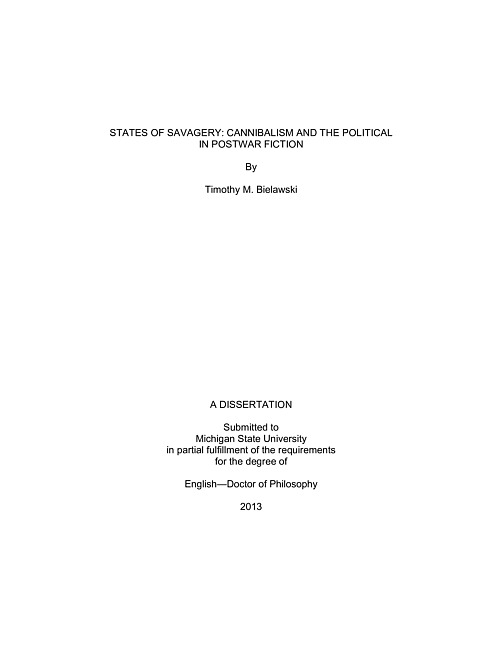 States of Savagery argues that, more than just the consumption of individual bodies, cannibalism figures the political struggle to define the boundaries between self and other, as well as the dangers inherent in this struggle--the possible eradication of the personal and social body. Cannibalism thus registers the interrelationship of political incorporation and state violence. It marks the ways in which political entities are envisioned as body politics that consume and expel, that violently rend individuals in the making of "The People." Through analyses of John Hawkes's The Cannibal, Thomas Pynchon's Gravity's Rainbow, and Leslie Marmon Silko's Almanac of the Dead, this dissertation elucidates the nexus of political organicism, biopolitics, and state violence. It explicates how these novels utilize the cannibal trope to clarify the relationship between the "life" of the political body and the slaughter and consumption of "disposable" peoples. Cannibalism registers the unavoidable swing between biopolitical principles and necropolitical violence. It illuminates how the concept of the nation as a biological body entrusted with protecting its citizens' bare life inevitably leads to the notion that the political body must consume in order to survive and to metonymically feed its citizens. While political organicism sanctions sacrifice and naturalizes the political aggregate's consumption, the trope of cannibalism acts to denaturalize this violence and detrivialize the death of the other.
