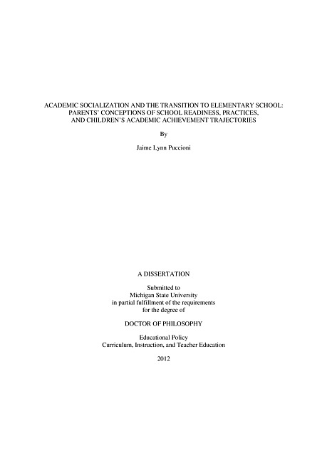 Academic socialization and the transition to elementary school : parents' conceptions of school readiness, practices, and children's academic achievement trajectories
