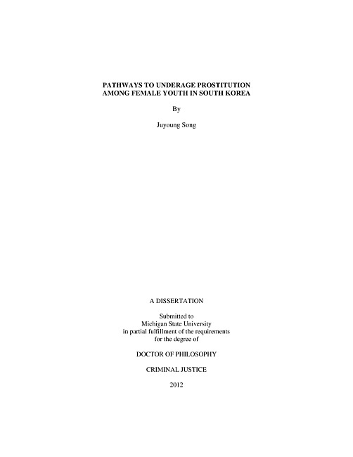 "The recent rapid social changes in South Korea have created a context that produced large increases in the number of girls involved in prostitution. By using in-depth interviews with 25 girls in South Korea, this study provides a narrative and life history analysis of girls' pathways into underage prostitution. The purpose of this dissertation is twofold: to identify pathways into underage prostitution and to examine girls' decision making process."--From abstract.