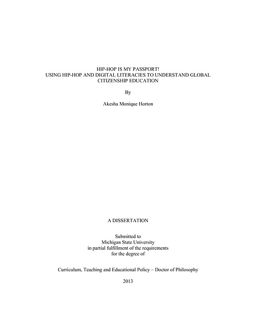 Hip-hop has exploded around the world among youth. It is not simply an American source of entertainment; it is a global cultural movement that provides a voice for youth worldwide who have not been able to express their "cultural world" through mainstream media. The emerging field of critical hip-hop pedagogy has produced little empirical research on how youth understand global citizenship. In this increasingly globalized world, this gap in the research is a serious lacuna. My research examines the intersection of hip-hop, global citizenship education and digital literacies in an effort to increase our understanding of how urban youth from two very different urban areas, (Detroit, Michigan, United States and Sydney, New South Wales, Australia) make sense of and construct identities as global citizens. This study is based on the view that engaging urban and marginalized youth with hip-hop and digital literacies is a way to help them develop the practices of critical global citizenship. Using principled assemblage of qualitative methods, I analyze interviews and classroom observations - as well as digital artifacts produced in workshops - to determine how youth define global citizenship, and how socially conscious, global hip-hop contributes to their definition.