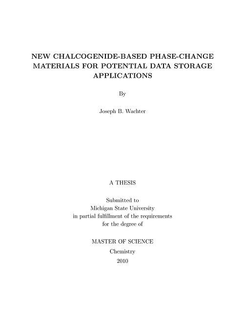 Phase-change materials are defined here as materials that undergo reversible, thermally activatedglass-to-crystal transformations. These materials are utilized commercially in datastorage media such as rewriteable CDs and DVDs as a way to reversibly encode binary data.The current industry standards for these materials are Ge2Sb2Te5 and several nonstochiometricalloys of Ag, Sn, Sb, Ge, In, and Te. The next generation of data storage devices callsfor faster switching rates, higher storage density, and better cyclability, for which the currentlyused materials may not be sufficient. This thesis will present several new chalcogenide-basedphase-change materials that contain alkali metals and the lighter chalcogenides S andSe. These materials, including K1-xRbxSb5S8, K2Sb8Se13, and K2Bi8S13, can be reversibly,thermally interconverted between glassy and crystalline phases. They are semiconductorsand have optical band gaps in the range of 0.9-1.8 eV, which permits encoding by visibleor ultraviolet laser irradiation. The 1-xRbxSb5S8 family of solid solutions shows the abilityto tune the thermal and optical properties of these materials by changing the value of x.K2Sb8Se13 shows the extremely rare behavior of polyamorphism wherein there exists twodistinct amorphous phases as well as a crystalline phase, and each is stable and can be isolatedat room temperature. Formed as a thin film on glass and silicon substrates, K2Bi8S13was shown by kinetic measurements to have the potential to switch faster than existing materials.These compounds were characterized by thermal and optical analysis (DTA, DSC,UV-Vis), X-ray diraction (XRPD, PDF), and electron microscopy (TEM, SEM).
