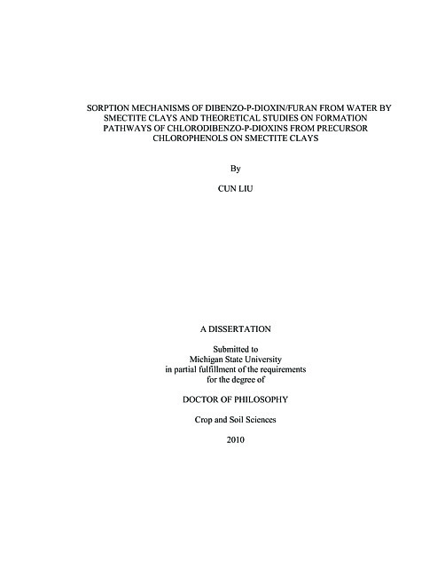 Clay minerals may be an important sorptive phase for dioxins in soils, and dioxins are often found in natural clay deposits. Sorption experiments demonstrated that smectites, especially Cs-saponite, effectively adsorbed dibenzo-p-dioxin /furan from water. Adsorption was promoted by exchangeable cations with low hydration energies, and negative charge in the smectite arising from the tetrahedral siloxane sheets. X-ray diffraction measurements revealed that as dibenzo-p-dioxin (DD) loading increased to ≥ 8,000 mg/kg the clay basal spacing increased abruptly from 12.3 to 15.2 Å, thereby demonstrating DD intercalation. The 12.3 Å spacing provides an interlayer distance that closely matches the molecular thickness of DD. The geometrical configurations of intercalated DD in the interlayer were investigated by a combination of ab initio calculations and Fourier transformation infrared spectroscopy. Molecular dynamics simulations of saponites saturated with different exchangeable cations (Na+, K+, Cs+ and Ca2+) with one, two and three layers of water in the interlayer regions further supported the hypothesis that Odd-interlayer cation complexation plays an important role in adsorption and the order of coordination numbers between Odd-interlayer cation follows Cs+>K+>Na+>Ca2+, in good agreement with the observed DD adsorption to the smectites from water.Octachlorodibenzodioxin (OCDD) forms spontaneously from pentachlorophenol (PCP) on the surfaces of Fe(III)-saturated smectite clay. Here, in situ FTIR methods and quantum mechanical calculations were used to determine the mechanism by which this reaction is initiated. As the clay was dehydrated, vibrational spectra showed new peaks that grew and then reversibly disappeared as the clay rehydrated. Density functional theory (DFT) calculations of hydrated Fe-PCP clusters reproduced these transient FTIR peaks when inner-sphere complexation and concomitant electron transfer produced Fe(II) and PCP radical cations. Thus, our experimental (FTIR) and theoretical (quantum mechanical) results mutually support the hypothesis that OCDD formation on Fe-smectite surfaces is initiated by the reversible formation of metastable PCP radical cations via single electron transfer from PCP to Fe(III). The negatively charged clay surface apparently selects for this reaction mechanism by stabilizing PCP radical cations. DFT methods were further applied to the calculations of 2,4,5-trichlorophenol (2,4,5-TCP) interacting with iron(III) species to evaluate the possible reaction pathways and the associated reaction energies and activation energies. The calculations support the formation of the direct precursors of the most toxic PCDD congener, 2,3,7,8-TCDD, and of 1,2,4,7,8-pentachlorodizenzodioxin, and two additional dimers, from the reaction of 2,4,5-TCP with Fe(III)-montmorillonite clay, which imply that soil contaminated with 2,4,5-trichlorophenol may have the potential risk for 2,3,7,8-TCDD contamination.
