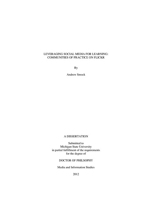 Research has begun to address the use of social media sites, such as Facebook and Twitter, for supplementing and enhancing classroom-based learning. However, the use of social media platforms for less formal learning has received little attention. Study One of this dissertation presents the results from semi-structured interviews with twenty-one users of the photo-sharing social media site Flickr about their Flickr use, focusing on how participants learn more about photography through their use of the site. Utilizing the communities of practice lens, findings illustrate how Flickr Groups function as communities of practice. Participants describe solitary and interactive learning strategies they employed which allowed them to advance their photographic knowledge and skills. The role of expertise emerged as an important factor in sharing knowledge about photography.Access to experts has been found to be a motivating factor for participation in online CoPs and expertise has also been linked to contribution in online communities. Study Two presents the results of an online survey of Flickr users (N=200), which measured three key forms of participation in Flickr CoPs (photograph posting, commenting, and discussion board posts), photographic expertise, and personality traits. Findings revealed that user expertise predicts certain forms of Flickr CoP participation, including commenting and sharing knowledge. Personality traits were also found to predict user activities, such as commenting and asking questions. The combined findings of these studies demonstrate how social media can be used as a powerful learning tool and shed light on how users leverage site affordances for learning
