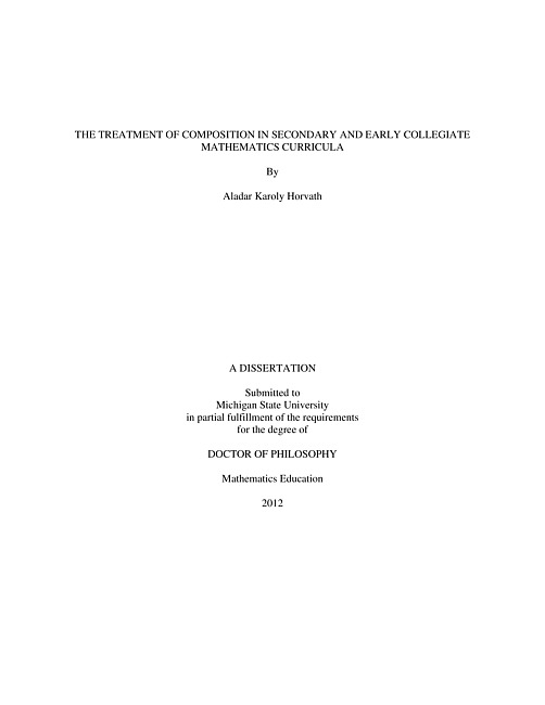Composition has been described as essential for understanding functions (Carlson, Oehrtman, & Engelke, 2010; Cooney, Beckmann, & Lloyd, 2010). Studies of students' understanding of function composition have shown that students use multiplication and other operations in place of composition (Carlson et al., 2010; Horvath, 2010).While there have been studies of students' knowledge of composition, the teaching of and curricular development of composition has not received as much attention. This dissertation attempted to fill this void by examining the treatment of composition in secondary and early collegiate mathematics curricula. By examining the definitions, explanations, and uses of composition, I was able to describe the kinds of explicit and implicit opportunities that textbooks provide to students with respect to the concept of composition.This analysis of textbooks of high school algebra 1 and 2, geometry, and precalculus and collegiate precalculus and calculus textbooks utilized multiple frameworks. Mathematically, composition can be viewed as an operation on objects (e.g., functions or relations) or as a recursive sequence of processes where the output of the nth process is the input of the n+1st process. A framework of procedural, conceptual, and conventional knowledge was used to describe the ways that textbooks define, explain, and perform composition. The representation (e.g., algebraic, graphical, tabular) and type of function, relation, or transformation (e.g., polynomial, reflection) is also included in the coding scheme of this study.The results indicated that composition appeared throughout the secondary and early collegiate curriculum and utilized functions as both objects and processes. Composition content was predominately presented using the algebraic representation and the use of compositive structure in transcendental functions was largely implicit. This examination provided background information for existing studies of student knowledge of composition and provides a framework for future studies of the teaching and learning of composition.