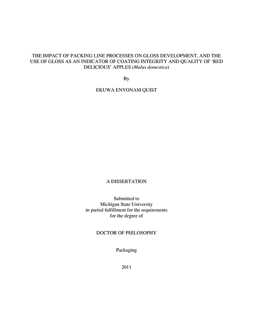THE IMPACT OF PACKING LINE PROCESSES ON GLOSS DEVELOPMENT, AND THE USE OF GLOSS AS AN INDICATOR OF COATING INTEGRITY AND QUALITY OF `RED DELICIOUS' APPLES (Malus domestica)ByEkuwa Enyonam QuistApples are coated with food grade waxes to maintain and improve quality, such as color and firmness, and to enhance gloss. In this study, a combination of simulated packing line cleaning and wax application processes were used to evaluate their efficiency in cleaning and developing gloss on `Red Delicious' apples. Commercially available alkaline and neutral detergents were applied in a pilot packing line while varying the temperature and dwell time in the dump tank (DT) together with the rinse-water pressure and dwell time on the washing brushes (WB) to simulate the cleaning process. A solvent extraction system quantifying surface residue after cleaning was developed to evaluate cleaning efficiency. The alkaline detergent was more effective in acquiring a cleaner surface than the neutral detergent. Increasing the temperature of the DT also resulted in a significantly cleaner surface. Cleaned fruit were subsequently waxed with commercially available shellac fruit coatings at different viscosities; they were applied and "dried" in different environmental conditions of temperature and relative humidity (RH) to investigate the conditions conducive for gloss development and the maintenance of the quality attributes of weight and firmness. A non-destructive device for measuring gloss on curved surfaces was developed and correlated to the human perception of gloss. The wax viscosity with RH in the drying zone, and the duration of drying significantly affected the gloss. The inability to remove moisture from the apple surface in the drying zone under high RH conditions in the environment decreased the ensuing gloss as a result of dilution and therefore a decrease in the deposition of the coating thickness. Wax with higher viscosity "dried" under lower RH conditions produced significantly higher glossed fruit compared to a lower viscous formulation. Furthermore, the decay of gloss during storage was accompanied by decreasing attributes of weight and firmness as the uniformity and integrity of the wax coating deteriorated.Respiration as influenced by the availability of O2 was impacted by the barrier properties of the peel and storage temperature. Hand-coated shellac `Red Delicious' apples were "dried" at 50 oC under two RH conditions of 25 and 60%, and stored at 4, 10 and 20 oC for a month. In this controlled system, it was determined that the drying treatments resulted in varied coating thickness, surface roughness and gloss. Surface gloss was determined to be directly related to coating thickness, and inversely to surface roughness through the use of micrographs. The transmission of respiratory gases through shellac was studied by bar-coating polyethylene film with different shellac wet thicknesses, 4 and 10 μm. The transmission rate of O2 was higher at higher temperatures with a corresponding increase in respiration rate, production of CO2 per g of fruit. The increase in respiration rate was accompanied by an increase in the loss of fruit weight. All of these increases were less pronounced in higher glossed fruit. In contrast the internal CO2 concentration was higher for the higher glossed fruit. Coated fruit, compared to the uncoated, recorded lower respiration rates with significantly reduced gloss and weight loss.KEYWORDS: `Red Delicious' Apples, Packing Line, Fruit Detergent, Shellac Coating, Gloss, Microstructure, Quality, Respiration Rate, O2 and CO2 Transmission Rate.