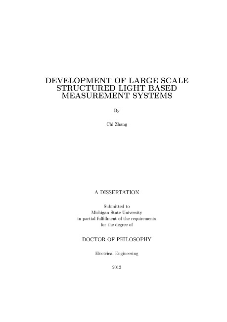 The development of large scale structured light based dimensional measurement systems is introduced in this study. Based on different applications, there are generally two different research directions for a structured light system: accuracy 3D inspection and fast environmental reconstruction. The first one is emphasized on the accuracy of the results and the second one is mainly concerned about reconstruction speed. Both of them become challenge tasks when the systems' scales increase.Quality inspection is a process to evaluate the quality of a manufactured work piece's 3D shape. Compared with traditional Coordinate Measurement Machine (CMM), structured light based optic measurement has the merits of fast speed, high inspection sample rate, and overall simplicity of operation, and becomes a popular alternative inspection method for CMM. The measurement result, point cloud of the test work piece, is compared with the Computer Aided Design (CAD) model to find the error distribution map. The color-code error distribution map will be further evaluated with the acceptable tolerance. There are basically three main issues, when the system scale is enlarged.Calibration of such a large system with long standoff distance, large Field Of View (FOV), deep Depth Of View (DOV), and multi-sensor became a challenge task. The calibration errors are enlarged when a large scale system is treated. In order to maintain high accuracy, an innovative 3D sensor model with less calibration parameters was developed. Instead of employing the incident light in projector frame, 3D point recovery was achieved within the camera frame via plane induced parallax information, in which projector's intrinsic and orientation are avoided in the 3D model. Precision of the large scale optic system was also simulated and was tested against the random image noise in the system. Multiply-plane strategy was developed and implemented to calibrate the sensor.As the system scale increased, more work pieces could be inspected at the same time. The optical properties became more complicated. Same with all the other vision based measurement system, structured light systems is usually weak against surface optical properties. Material exhibiting different color textures, reflection ratios, and especially a mixture between specula reflection and diffuse reflection, fails the optic sensor to correctly acquire incident light information. Traditional structure light method is only valid for parts with diffuse reflection property. Therefore pre-treatment of the surface have to be added before inspection. Aiming on this problem, a structured sensor with a robust surface decoding method for industry application was developed. The coding strategies were properly designed against variously test surface optic properties. Monochromatic light was utilized against different object color textures. The illumination of the projector was adjusted pixel by pixel based on the optic properties of the test material to composite different reflection coefficients and internal reflection. Furthermore, an extrapolation model to solve the internal reflection problem and a sub-pixel interpolation model to increase measurement accuracy were proposed too. The proposed system was capable to inspect various materials with different shapes and different optic properties, from black, dark, to shiny.Registration among sensor frame to the common was achieved based on Iterative Closest Point (ICP) method. The final point cloud joined by each individual point cloud could represent the 3D shape of a large work piece. Object-oriented on-line calibration was developed based on ICP and Geometry Dimension and Tolerance (GDT) information to register the final point cloud and the CAD model. Several modifications to traditional ICP are applied to speed up the registration process due to the large amount of points in both sets.Environmental reconstruction for navigation is a process to quickly acquire surrounding information around the vision sensor and presents a 3D fusion display for the operator. Traditional navigation system only employed a camera to view the environment, in which the depth information is lost. Operator is often confused with the object distance, the distance between the object and the camera. Structured light system based on infrared light could quickly rebuild objects depthes and fuse it into the displayed images without influence the operator's normal vision. The sensed points on the objects are highlighted by the color-codes: from red to blue, which are used to indicate the object distances.Fast environmental reconstruction emphasizes the acquisition time. In order against the moving objects, an one-shot surface coding algorithm was developed. Only one projection image is needed to acquire the 3D information. The codeword is determined in a single pattern because the code of each primitive depends on the values of the primitive and its neighbors. Compared with the previous patterns, this pattern is more robust because it can avoid the influence of the ambient light and the inspected part reflective property. Moreover, the requirement of the accuracy performance is achieved by the pattern primitive which is similar to the corner of the checker board since it can provide high accuracy performance even when the occlusion occurs.In order to reconstruct the environment without blind areas, an omni-direction panoramic structured light sensing system was developed to increase the system field of reconstruction. Hyperbolic mirrors are put in front of a projector and a camera. 3D reconstruction model was build up associated with the hyperbolic mirror. Task level calibration is conduct for the system. At last, a 360 image fused with depth information is achieved by the designed system.In summary, the study developed large scale structured light systems based on two different applications: accurate inspection for industry quality control and fast environmental reconstru