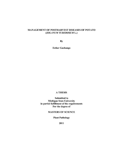ABSTRACTBy Esther GachangoManagement of Postharvest Diseases of Potatoes (Solanum tuberosum L.)Postharvest diseases of potatoes such as late blight (Phytophthora infestans), Fusarium dry rot (Fusarium sambucinum and spp.), Pythium leak (Pythium ultimum) and Pink rot (Phytophthora erythroseptica), are responsible for significant economic losses in the potato industry. Management of these diseases using biocontrol fungicides and conventional fungicides was evaluated on cv. FL 1879 at 10°C. Phosphorous acid, hydrogen peroxide and azoxystrobin applied in storage was moderately effective in controlling pink rot, Pythium leak and late blight pathogens compared to Bacillus subtilis and Bacillus pumilus. In&ndashseason application of phosphorous acid followed by bin loading applied phosphorous acid reduced late blight incidence, while field treatment with phosphorous acid or mefenoxam followed by storage treatment with phosphorous acid reduced pink rot and Pythium leak incidence. Field treatment with B. subtilis or mefenoxam followed by storage treatment with B. subtilis, the 3&ndashway mixture of azoxystrobin, fludioxonil and difenoconazole or phosphorous reduced dry rot incidence. Eleven species of Fusarium were isolated from dry rot symptomatic seed potato tubers in Michigan. All the species were pathogenic to potato tubers with F. sambucinum being the most aggressive. In vitro tests showed that all isolates were sensitive to difenoconazole; only F. sambucinum isolates were insensitive to thiabendazole and both sensitive and insensitive-fludioxonil isolates of F. sambucinum and F. oxysporum were reported. Registration of new chemistries for control of Fusarium dry rot is necessary.