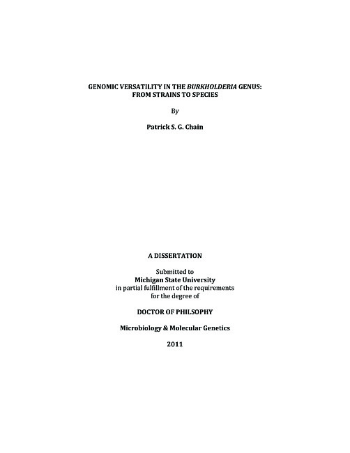 "The group of closely related organisms classified as Burkholderia encompass a very impressive array of phenotypic properties. Using a multitude of genomic and bioinformatic methods, this thesis explores the similarities and differences at various taxonomic levels among genomes sequenced from this genus, attempts to relate some of these discoveries to other species, and discusses the implications of these findings on broader scientific questions"--From abstract.