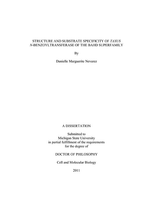 The native Taxus N-debenzoyl-2<&rsquo>-deoxypaclitaxel:N-benzoyltransferase (NDTBT) from the paclitaxel pathway transfers a benzoyl group from the corresponding CoA thioester to the amino group of the <&beta>-phenylalanine side chain of N-debenzoyl-2<&rsquo>-deoxypaclitaxel. To elucidate the substrate specificity of NDTBT with a His6-fusion epitope was overproduced in Escherichia coli. The purified enzyme was incubated with semisynthetically derived N-debenzoyltaxoid substrates and aroyl CoA donors (benzoyl; ortho-, meta-, and para-substituted benzoyls; various heterole carbonyls; alkanoyls; and butenoyl). Several unnatural N-aroyl-N-debenzoyl-2<&rsquo>-deoxypaclitaxel analogues were biocatalytically assembled with catalytic efficiencies (Vmax/KM) ranging between 0.15 and 1.74 nmol/min/mM. In addition, several N-acyl-N-debenzoylpaclitaxel variants were biosynthesized when N-debenzoylpaclitaxel and N-de(tert-butoxycarbonyl) docetaxel (i.e., 10-deacetyl-N-debenzoylpaclitaxel) were used as substrates. The relative velocity (vrel) for NDTBT with the latter two N-debenzoyl taxane substrates ranged between ~1% and 200% for the array of aroyl CoA thioesters compared to benzoyl CoA. Interestingly, NDTBT transferred hexanoyl, acetyl, and butyryl moieties more rapidly than butenoyl or benzoyl groups from the CoA donor to taxanes with isoserinoyl side chains, whereas N-debenzoyl-2<&rsquo>-deoxypaclitaxel was more rapidly converted to its N-benzoyl derivative than to its N-alkanoyl or N-butenoyl congeners. Biocatalytic N-acyl transfer of novel acyl groups to the amino functional group of N-debenzoylpaclitaxel and its 2<&rsquo>-deoxy precursor reveal the surprisingly indiscriminate specificity of this transferase. This feature of NDTBT potentially provides a tool for alternative biocatalytic N-aroylation/alkanoylation to construct next generation taxanes or other novel bioactive diterpene compounds.To elucidate the basis of the broad substrate specificity and to direct mutational analysis, the crystal structure for NDTBT was sought. Therefore, several chromatographic methods were applied to increase the purity of the protein from 70%, obtained in previous attempts, to >95%, without losing activity. This sequence of chromatographic steps was also used to purify 10-deacetylbaccatin III: 10<&beta>-O-acetyltransferase (DBAT) and a modified taxane-2<&alpha>-O-benzoyltransferase (mTBT) to 90-95% purity. Preliminary screens for crystals of purified NDTBT (at 5 mg/mL) with and without benzoyl CoA in a matrix of crystallization buffers were negative. The histidine tag was hypothesized to inhibit crystallization and thus is currently being removed; attempts to cleavage of the His6-tag from NDTBT by thrombin-catalyzed scission yields only ~10% of the liberated protein.Meanwhile, a mutagenesis study was constructed to examine potential structural components of the Taxus acyltransferase family responsible for substrate selectivity. Regional and domain swapping between pairs of enzymes: NDTBT/DBAT and DBAT/mTBT were employed to evaluate these structural hypotheses. Vinorine synthase and anthocyanin malonyltransferase, homologousenzymes in the same BAHD family whose structures have been solved, were used as models to identify mutagenic sites for constructing the chimeras of the Taxusenzymes. The so-derived mutant chimeras were purified from a nickel affinity column at 0.24 mg/L yield. The mutants were incubated with the parent substrates and none of the mutants made products detectable by LC-ESI/MS analysis. The chimeras are potentially inactive because incorrect splicing sites were perhaps unexpectedly identified to construct the mutant enzymes.
