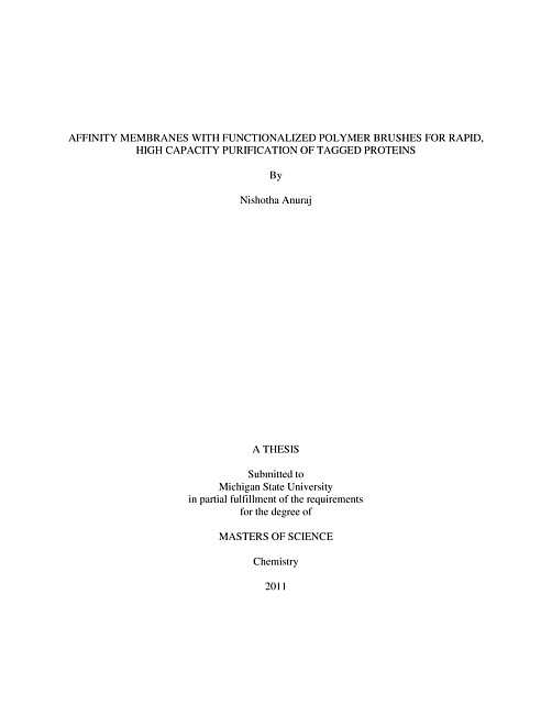 Porous membranes are useful for protein purification because convective mass transport rapidly brings proteins to binding sites, which should minimize diffusion-based limitations and also decrease non-specific adsorption and increase protein purity. Unfortunately membranes have low binding capacities compared to columns, but modifying membrane pores with polymer brushes can greatly enhance protein binding. This thesis describes an aqueous method to grow polymer brushes from macroinitiators adsorbed in membranes pores. Compared to growth of brushes from silane initiators, this method leads to 4-fold increases in membrane permeability and an order of magnitude decrease in the time required for brush polymerization. The aqueous method is applicable to a wide range of polymeric membrane including nylon, polyethersulfone and polyvinylidine fluoride. Poly(2-(methacryloyloxy)ethyl succinate brushes grown from macroinitiators in nylon membranes bind as much as 120 mg lysozyme/cm3 of membrane, and when functionalized with nitrilotriacetate-Ni2+ complexes these brushes bind 85 mg/cm3 of polyhistidine-tagged (His-tagged) proteins. More importantly, these membranes isolate His-tagged proteins directly from complex cell extracts. This thesis also investigate the effect of reduction of the areal density of the polymer brushes on protein binding and purification of maltose binding protein using maltose attached to polymer brushes.