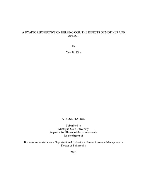 According to Bandura's social cognitive theory (1986), human action occurs in a system of reciprocal causation of interactions involving behavior, cognitions, and the environment. Reciprocal causation places particular emphasis on dyadic exchanges between individuals (Bandura, 1986). Despite the importance of dyadic interactions between helpers and helping recipients, a significant amount of research has considered either helpers or helping recipients (Spitzmuller et al., 2008). To date, not enough attention has been given to a dyadic perspective on helping organizational citizenship behavior (OCB) involving both helpers and recipients. Thus, to close this gap, the purpose of this dissertation is to draw on social cognitive theory (Bandura, 1986) and develop a model explicating a dyadic perspective on helping OCB. Specifically, I am interested in how helpers' helping motives lead to subsequent helping via two processes: the helper's affective state of pride and the recipients' affective state of gratitude. In addition, I investigate how helper pride and recipients gratitude predict subsequent helping by the helper. I utilize an experimental design to test my predictions using a dictator game that provides an objective measure of helping OCB. Taking a dyadic perspective on helping OCB provides a more complete picture of helping OCB by shedding light on the actions and reactions of both players: the helper and the recipient. In sum, a dyadic perspective on helping is noteworthy because it provides a platform for investigating unexplored and critical aspects of helping OCB processes.