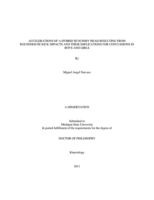 The purposes of this study were to determine the magnitudes of linear acceleration of the center of gravity and angular acceleration about the center of gravity on a Hybrid III dummy head, as a result of being impacted with roundhouse kicks performed by children and to compare these values with the same variables that are known in general to cause concussions. The potential for roundhouse kicks performed by children to cause a concussion was examined. Differences by age, gender and levels of expertise were also studied. Anthropometric data (body mass index, flexibility, sitting height, standing height, weight, biacromial and bicristal widths were also measured to study their effects on linear and angular accelerations. Results indicated that children can exceed linear and angular acceleration thresholds for concussions that have been established for NFL players. There are no known linear or angular acceleration thresholds for children, but these may be smaller than those used for comparisons in this study. Results also showed that female participants generated higher linear and angular acceleration values than male participants. Analyses revealed differences in linear and angular accelerations by age group where older participants generated higher acceleration values than younger participants. Skilled participants also generated greater maximal linear and angular accelerations than beginners. Months of practice, standing height, weight, and flexibility provided some explanation to the differences observed by age, gender, and skill level. It is necessary to educate parents, martial arts instructors, and governing bodies about the intrinsic risk for traumatic brain injuries, which has been reported to be similar to other contact sports such as American football, boxing, and ice hockey. The use of head gear and mouth guards is strongly recommended in practice and competition to reduce linear and angular accelerations that the brain experiences as a result of an impact to the head to eliminate concussions. The long term effects of single/multiple concussions in children are not known at this time; however recent studies are identifying its negative effects on cognitive functions, thus, it is suggested to reduce children exposure to these possible risks.