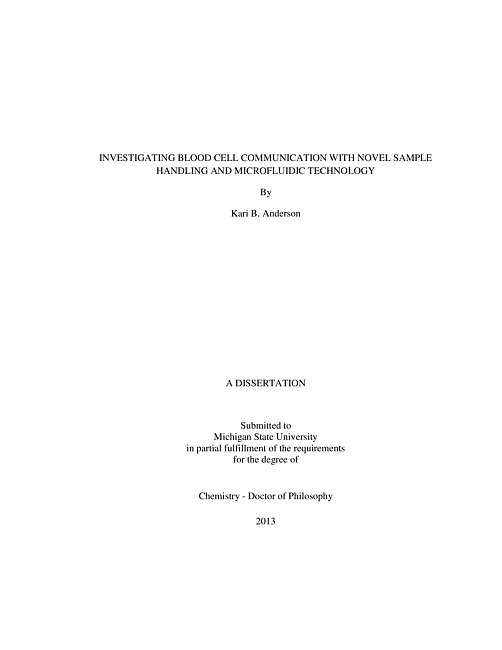 ABSTRACTINVESTIGATING BLOOD CELL COMMUNICATION WITH NOVEL SAMPLE HANDLING AND MICROFLUIDIC TECHNOLOGYByKari B. AndersonPuringergic receptor signaling events in platelets is a major determinant in platelet function. ADP binding to the P2Y-type receptors on platelet membranes, and the subsequent pathways evoked from this type of binding, is well-established. However, an understanding activity of the ATP-sensitive P2X1 platelet receptor is incomplete due to a number of obstacles involved with studying this receptor, in particular, the high concentrations of ATP already present in the washed platelet sample matrix. To circumvent this problem, most studies aimed at investigating P2X1 platelet activity require that the platelet samples contain apyrase in order to reduce already-existing levels of ATP and ready the P2X1 receptor for exogenously added ATP. Of course, one drawback to this method is that the apyrase will also rapidly degrade any added ATP. Here, we describe a method which, ironically, employs the reported P2X1 inhibitor NF449 to sensitize platelets in the absence of any added apyrase. Sensitization is verified by spectrofluorimetric determination of Ca2+ entry into the platelets after stimulation with concentrations of ATP ranging from 67 nM to 10 μM. Results suggest that sensitization of the P2X1 receptor by NF449 is not necessarily dependent upon the inhibitor concentration, but rather the ratio of the inhibitor and exogenously-added ATP concentrations. The sensitization by the NF449 was also found to be highly time-dependent. In order to study the platelet in the presence of red blood cells (RBCs) and endothelial cells a microfluidic approach was taken, but before vascular mimic could be created, some new microfluidic technologies were explored. A simple and inexpensive approach to fabricate polystyrene devices that is based upon molding polystyrene (PS) from Petri dishes against PDMS molds was developed. The ability to incorporate microchannels in polystyrene and integrate the resulting device with standard laboratory equipment such as an optical plate reader for analyte readout and pipets for fluid propulsion is described. A simple approach for sample and reagent delivery to the device channels using a standard, multi-channel micropipette and a PDMS-based injection block is detailed. Integration of the microfluidic device with these off-chip functions (sample delivery and readout) enables high-throughput screens and analyses. The device was sealed against a PDMS-base and compared against PDMS-based microchips in terms of their absorption of an anti-platelet drug, clopidogrel. Furthermore, these polystyrene devices were used to monitor two endothelial cell processes. One experiment involved the fluorescence measurement of nitric oxide (NO) produced within an endothelial cell line following stimulation with ATP. The result was a four-fold increase in NO production (as compared to a control), with this receptor-based mechanism of NO production verifying the maintenance of cell receptors following immobilization onto the PS substrate. The ability to monitor cellular uptake was also demonstrated by optical determination of Ca2+ into endothelial cells following stimulation with the Ca2+ ionophore A20317. The result was a significant increase (42%) in the calcium uptake in the presence of the ionophore, as compared to a control (17%) (p < 0.05). The ability to successfully culture cells on chip and measure analytes associated with that PS may be a useful material for microfluidic device fabrication. The PS device was further integrated with a polyester membrane in order to study drug transport across the membrane. However, significant absorption of clopidogrel still occurred so a device made only of PS was fabricated using an epoxy mold and hydraulic press to embed channels and seal devices. The result was a device with millimeter sized channels, but the ability to rapidly fabricate these devices was lost. Fluidic devices fabricated using conventional soft lithography are well suited as prototyping methods. Unfortunately, the prototypes tend to lack the ruggedness and reusability of methods associated with mass production techniques. 3 Dimensional (3D) printing, commonly used for producing design prototypes in industry, allows for one step production of devices. 3D printers build a device layer by layer based on 3D computer models. Here, a reusable, high throughput, 3D printed fluidic device was created that enables flow and incorporates a membrane above a channel in order to study drug transport and affect cells. The device contains 8 parallel channels, 3 mm wide 1.5 mm deep, connected to a syringe pump through standard, threaded fittings. The device was also printed to allow integration with commercially available cell inserts whose bottoms are constructed of a porous polycarbonate membrane; this insert enables molecular transport to occur from the channel to above the well. When concentrations of antibiotics, levofloxacin and linezolid, are pumped through the channels, approximately 18-21% of the drug migrates through the membrane. Finally, we show that mammalian cells cultured on this membrane can be affected by reagents flowing through the channels. Specifically, saponin was used to compromise cell membranes and a fluorescent label used to monitor the extent, resulting in a 4-fold increase in fluorescence for saponin treated cells.